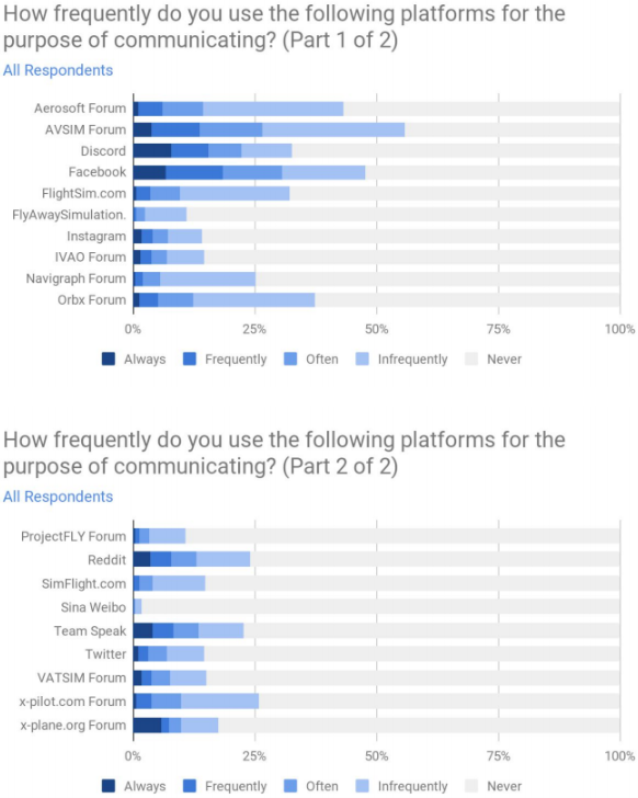 The three most popular sites to connect with other flight simulator users is the AVSIM forum, Aerosoft forum and Facebook. The X-Pilot forum has a larger user base than X-Plane.org’s forum according to the survey, but the popularity of the latter was significantly higher.