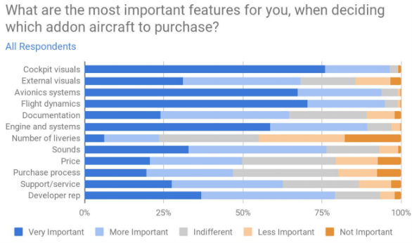 For aircraft addons, the cockpit visuals are the most important factor, which was very closely followed by the avionics systems, flight dynamics, and engine and systems. All other factors remained important such as developer reputation, but the number of liveries was by far the least important factor.
