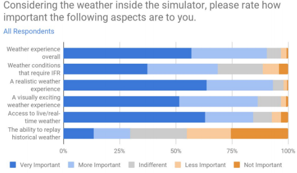 The other key aspect in flight sim addons is the weather: users said it was important that the overall weather representation was important, although weather that requires IFR conditions was not so important. Historical weather was much less of a concern, with almost 50% saying it was less or not important.