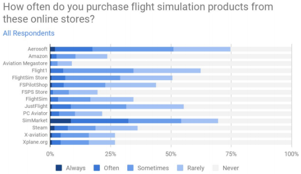As for software, most users spend around $200 per year. For X-Plane, X-Plane.org and X-Aviation had identical prefered store shares, but were overshadowed by larger stores such as Aerosoft, SimMarket and JustFlight, due to the presence of products for other platforms. The sector of flight simulation users prefer to spend the least on is flight planning and charts. The base simulator, navigational data and aircraft were preferred to be payware by most users, whilst scenery was a mixture of payware and freeware.
