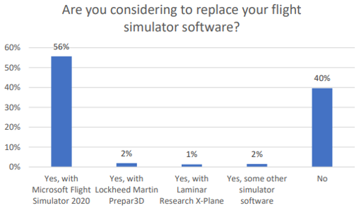 This arises from the fact that 56% of users are looking to replace their primary simulator software with MFS, and 40% remain content with their current software.