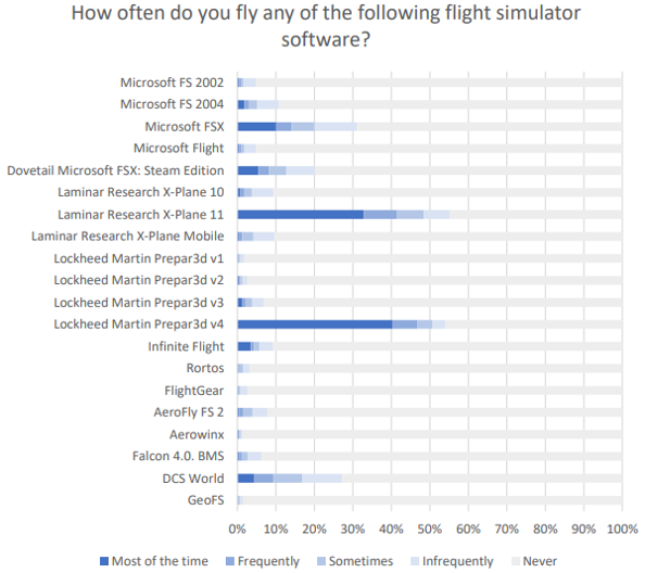 2019’s results is reasonably similar to those in 2018, but the survey was more extensive than ever to consider the changing landscape of flight simulation; most notably, it takes Microsoft Flight Simulator (MFS) into consideration as well as mobile simulators.