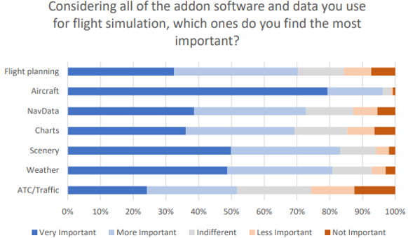 A question dedicated to addon type importance shows that – by a huge margin – aircraft is a ‘very important’ addon in a simulator, according to 79% of respondents.