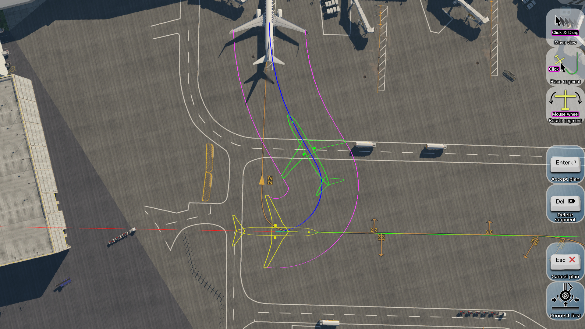 Each operation starts with planning the route the aircraft will take for the operation. In the image below, a small deviation to the right allows this Boeing 737-800 to be pushed back onto the taxiway safely. The simple instructions are always included on the right.