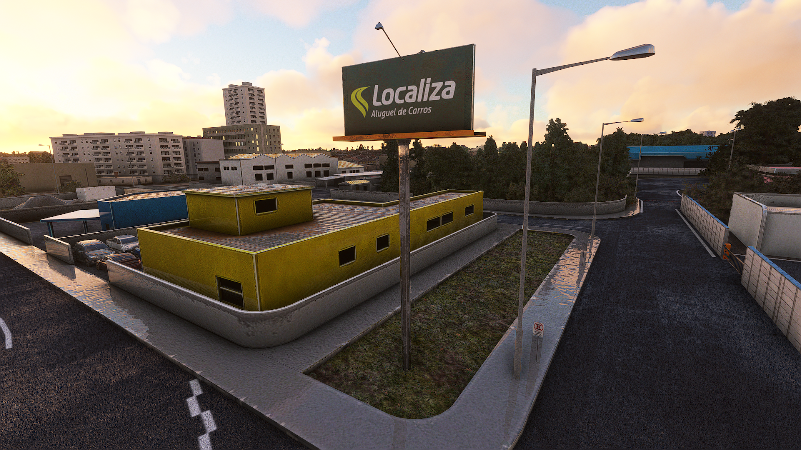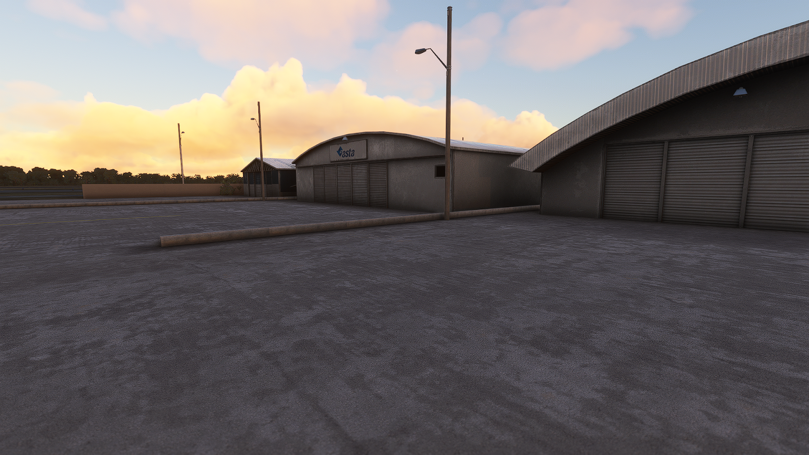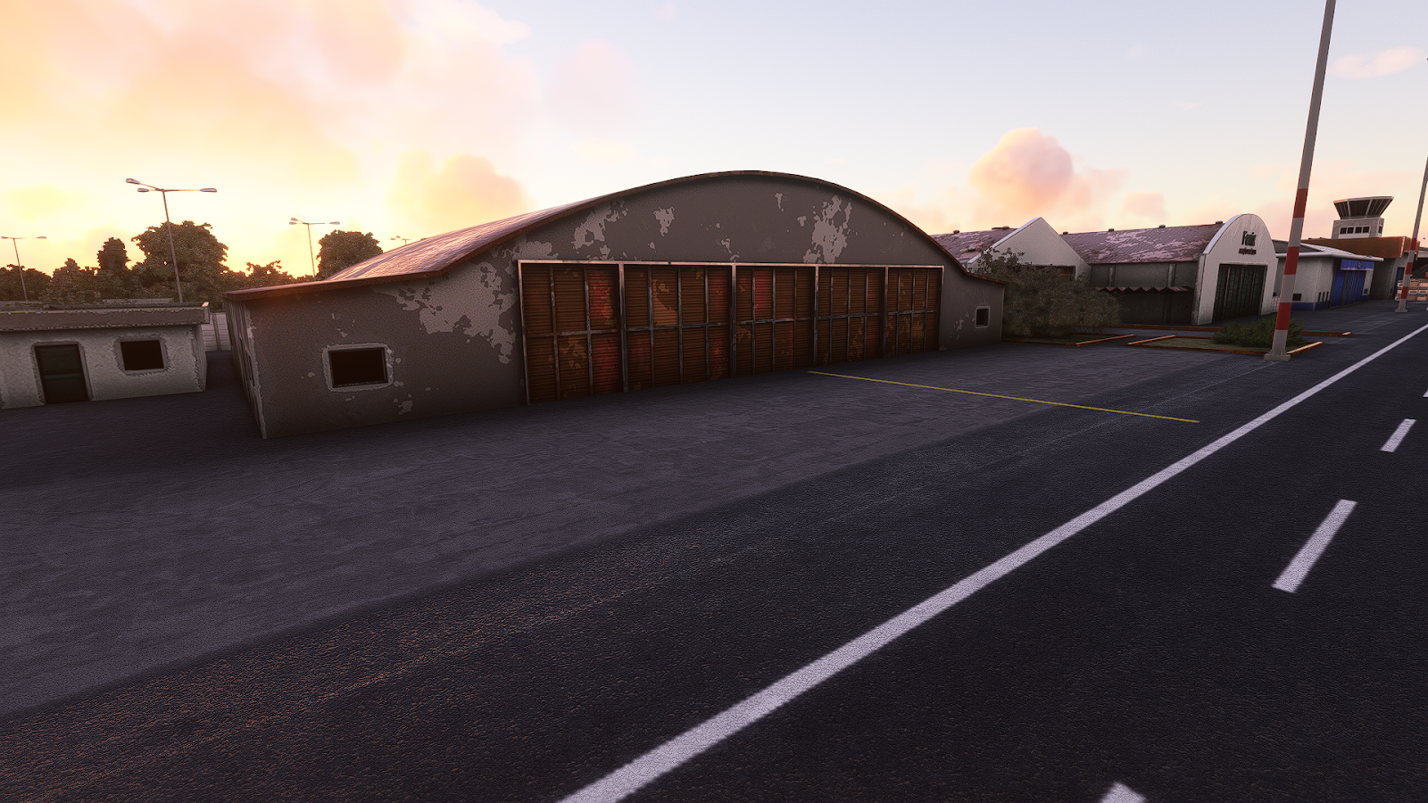 Dozens of other buildings and hangars are also present in the scenery, all with high-resolution PBR textures. The parking lot and surrounding buildings are also included in the package.