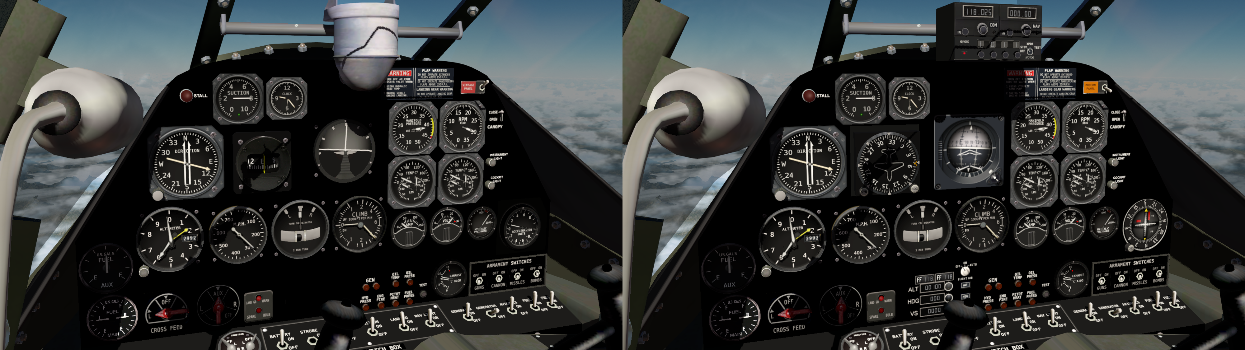 The cockpit is available in two flavours: vintage and modern; the latter of which contains radios, a basic autopilot and instrument modifications.