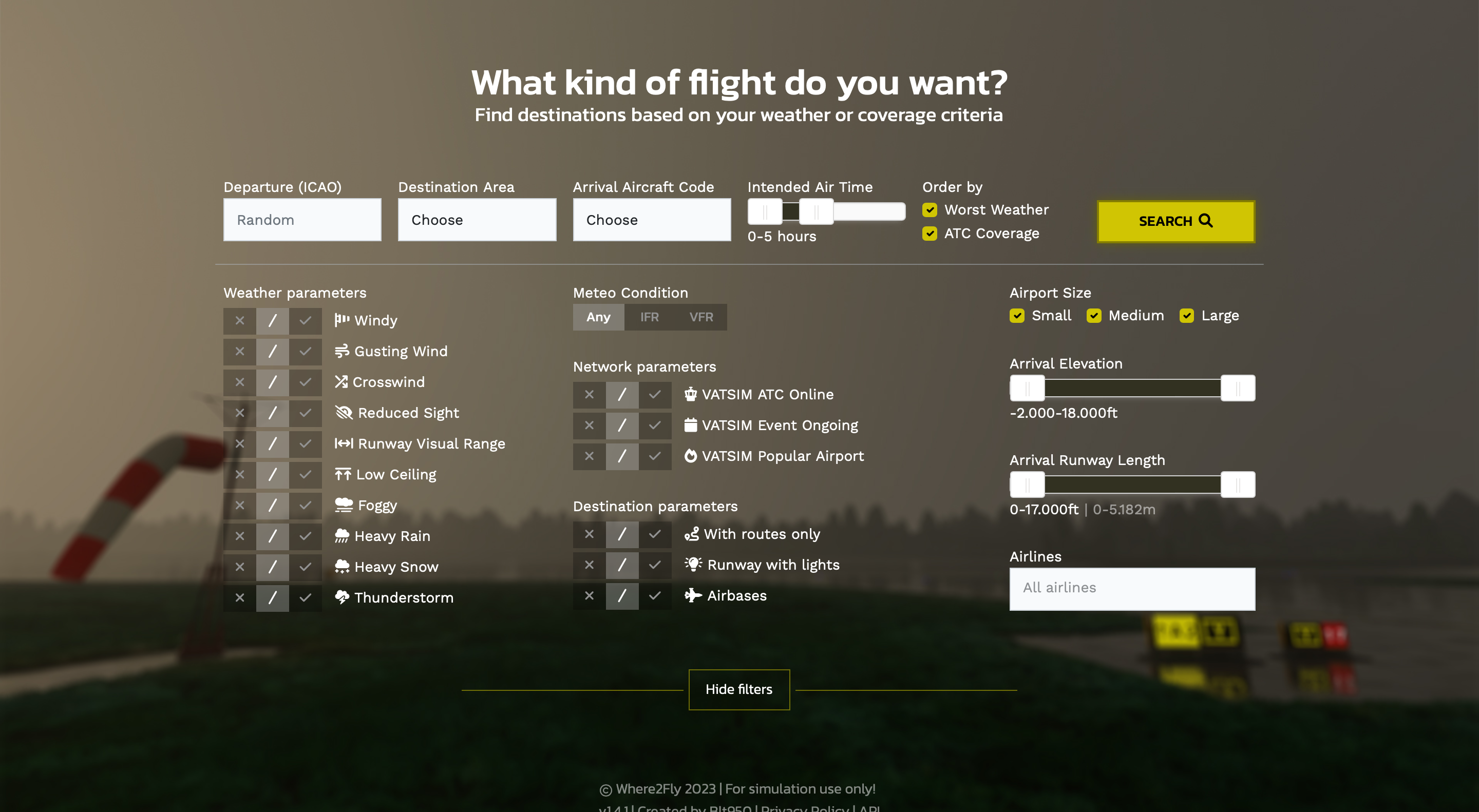 Where2Fly is a website that helps give you inspiration on what destination appeals to you the most. It was created by fellow simmer Daniel Lange, to help alleviate the struggle. It does this through a few functions, such as a basic search, which allows you to input the aircraft type code that you want to fly, the ICAO where you’re starting from, preferred flight time, and destination area. It also comes with a more advanced search function, if you want to refine your preferences even further. It has functions where you can filter to only airports with good VATSIM ATC coverage, or only if there’s a real route between the two airports, and even a variety of different weather conditions.