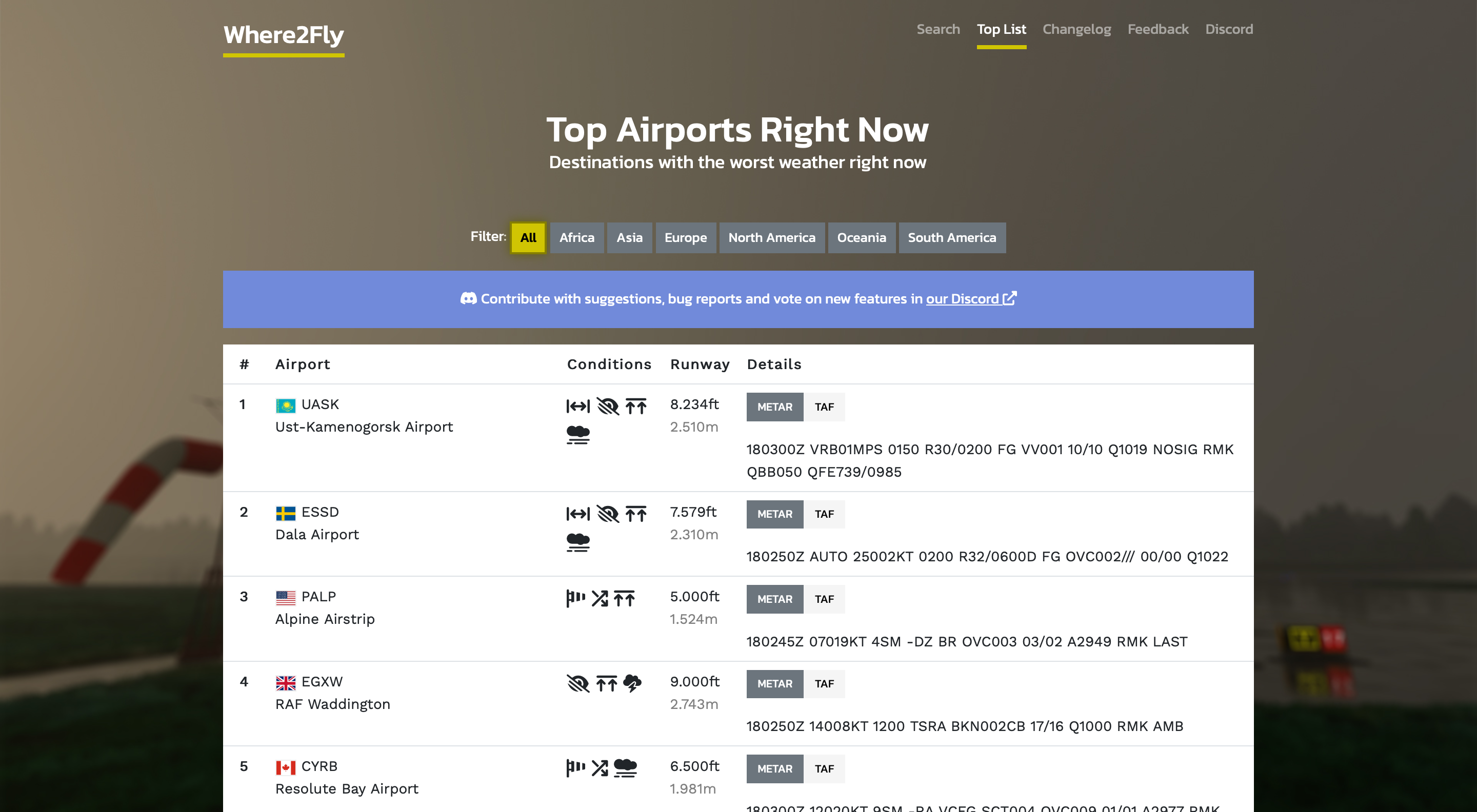 You can also filter the search by runway length and airport size, so you can tailor fit your route to your liking. Alongside the very powerful search functions, it also has a list of top airports per continent, based on the worst weather.