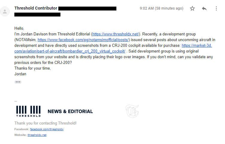 We covered the story to create awareness of the news, and it was received well by our readers, however, suspicions were raised when a link surfaced to a website called “CGTrader” with what appeared to be the same models NOTAMsim passed off as their own. Threshold reacted to this by giving NOTAMsim an ultimatum. Provide us proof that the model is your own or legitimately purchased, or we will take action.