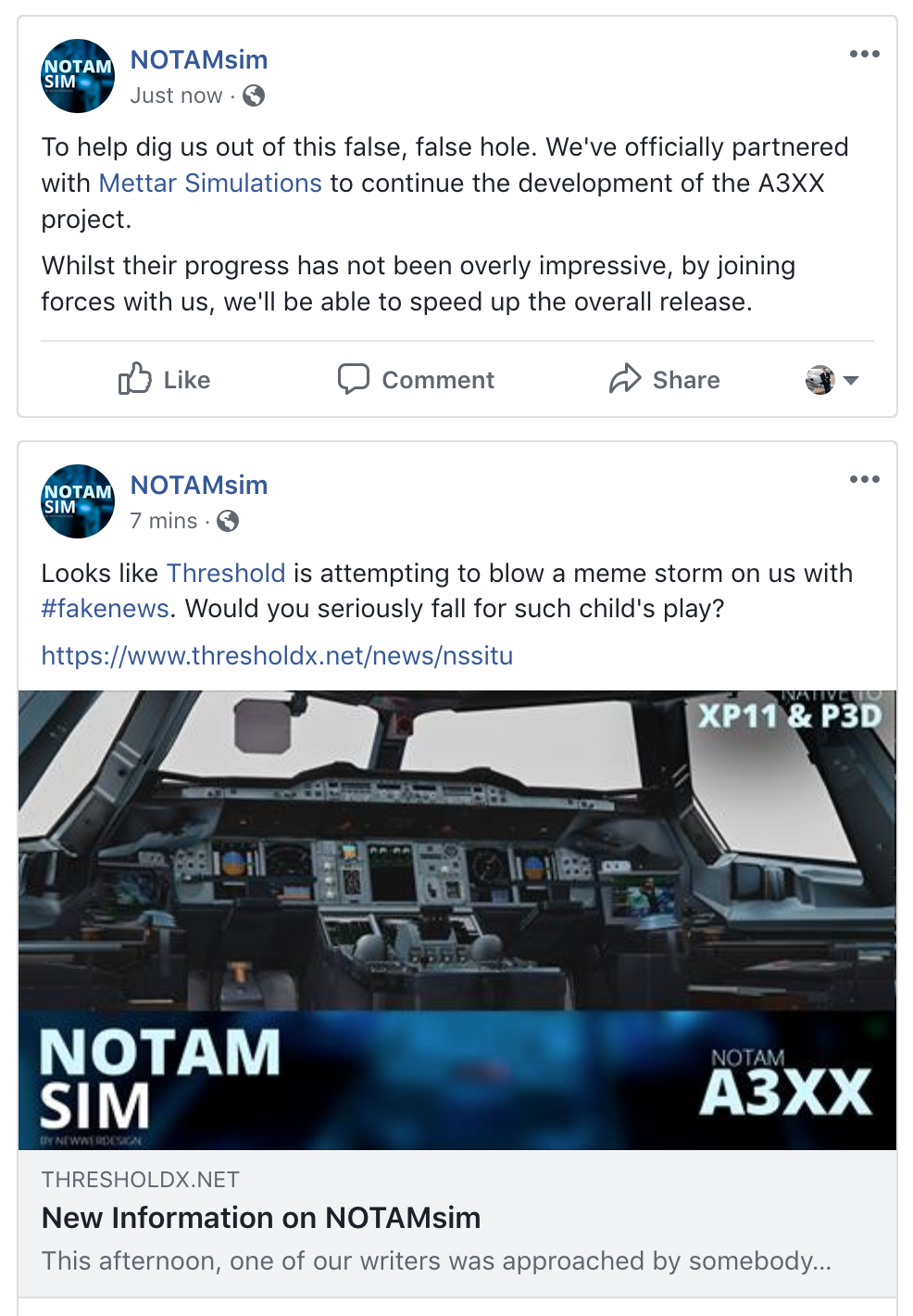“Hey everyone, tonight we had a page by the name of NOTAMsim make claims to be partnered with us for our A380 project amongst other things.