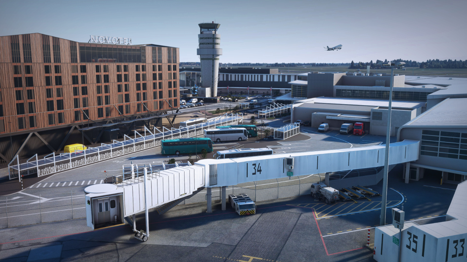 The scenery features a high-quality rendition of the airport, with full 3D custom modeling including the surrounding business parks (roughly 300 in total), the runways and apron are built with PBR materials, realistic ground markings, realistic roads, high resolution aerial imagery, terra-formed runway, parking positions setup with correct airline codes, interiors for the main terminal, custom jetway sounds, animated jetways (custom for each gate, matching real life), animated 3D people, animated custom AI vehicles around the airport, and a working surveillance radar.