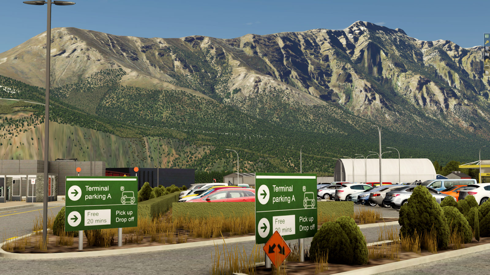- True-to-life airport landside recreation with custom ground decals, signposts, vegetation,