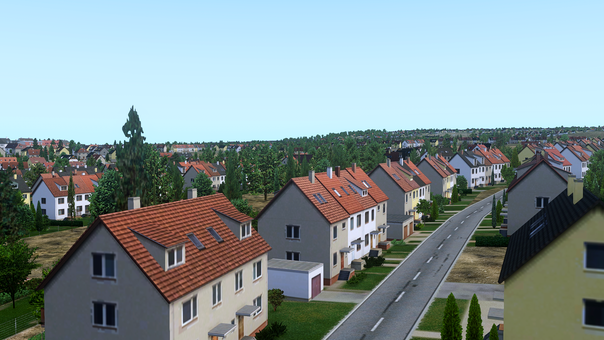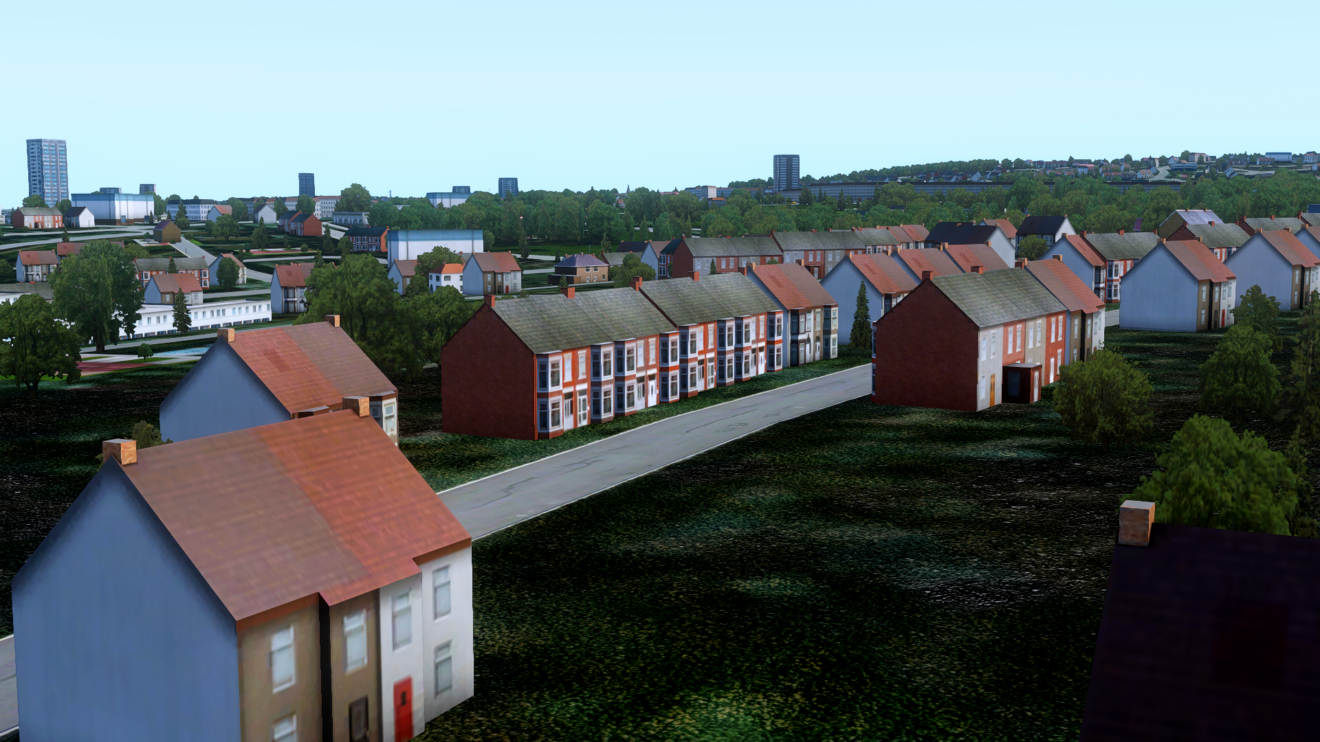 One of Orbx’s claimed improvements is for better UK-type houses, i.e. semi-detached housing. However on closer inspection, it looks to be the case of “one step forward, one step backwards”. The changes in the individual houses seem very minimal, but with TrueEarth, there seem to be less total houses (both tested on the same object setting). Comparison below: