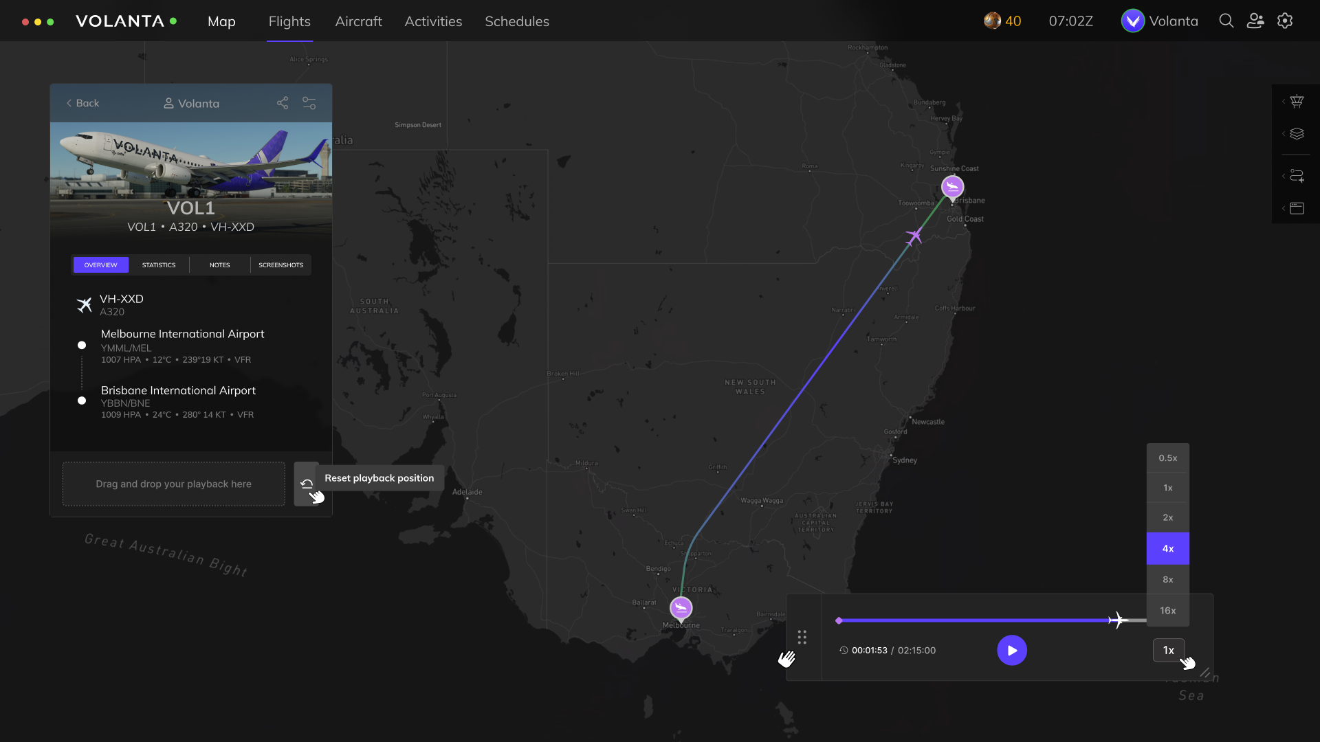 ⦁ Added playback controls for past flights! Flights can now be “replayed” in Volanta at various speeds with an intuitive timeline-like navigation experience that marks key events such as landings.
