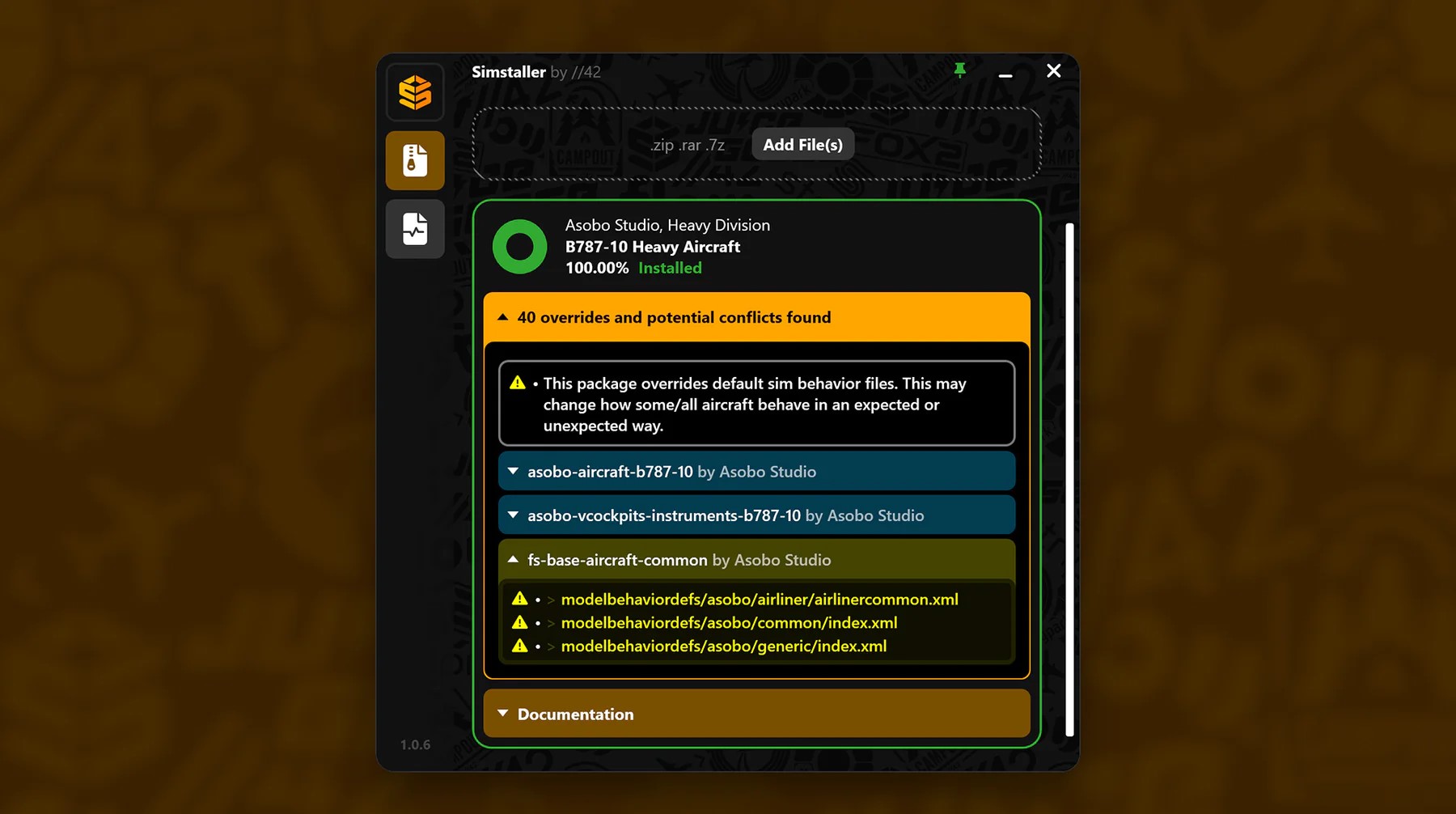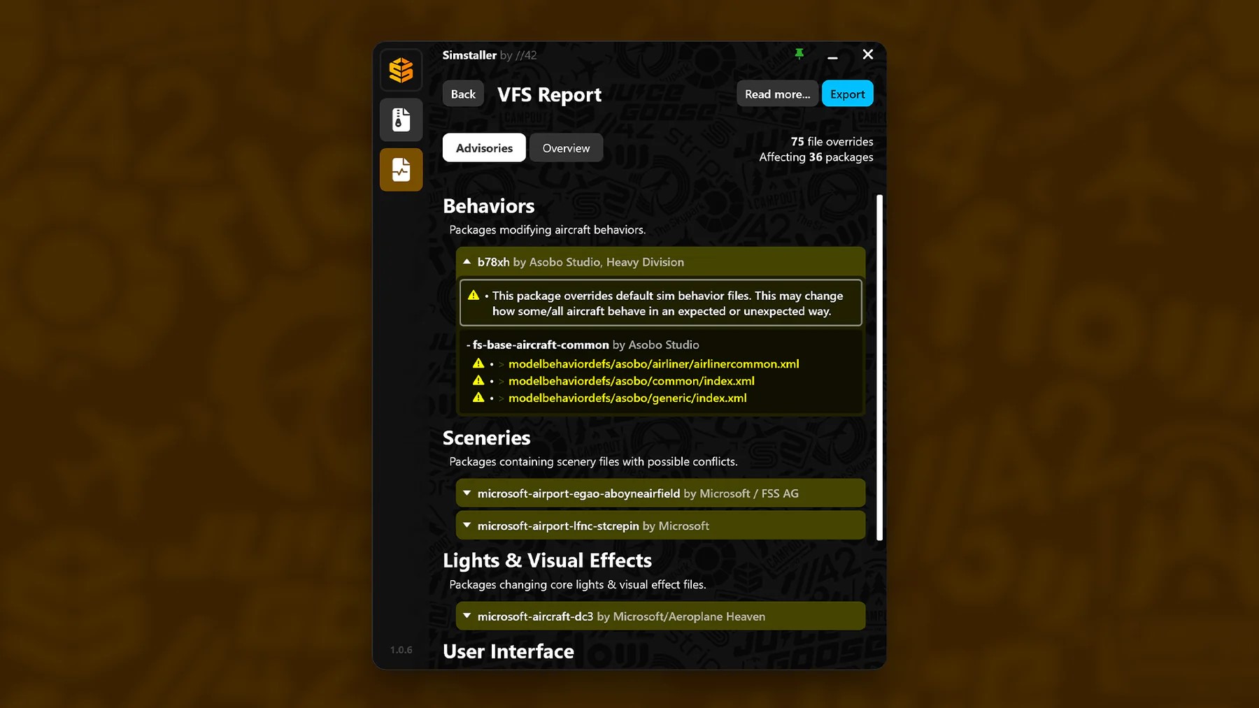 The Virtual File System (VFS) scans and detects issues, alerting you to packages that override critical core operations or unintended game modifications. With Simstaller, you can identify who or what is overriding the functions of the simulation. Simstaller provides welcome relief for individuals fatigued by the constant need to troubleshoot errors and pinpoint the root causes of issues within Microsoft Flight Simulator’s community folder.