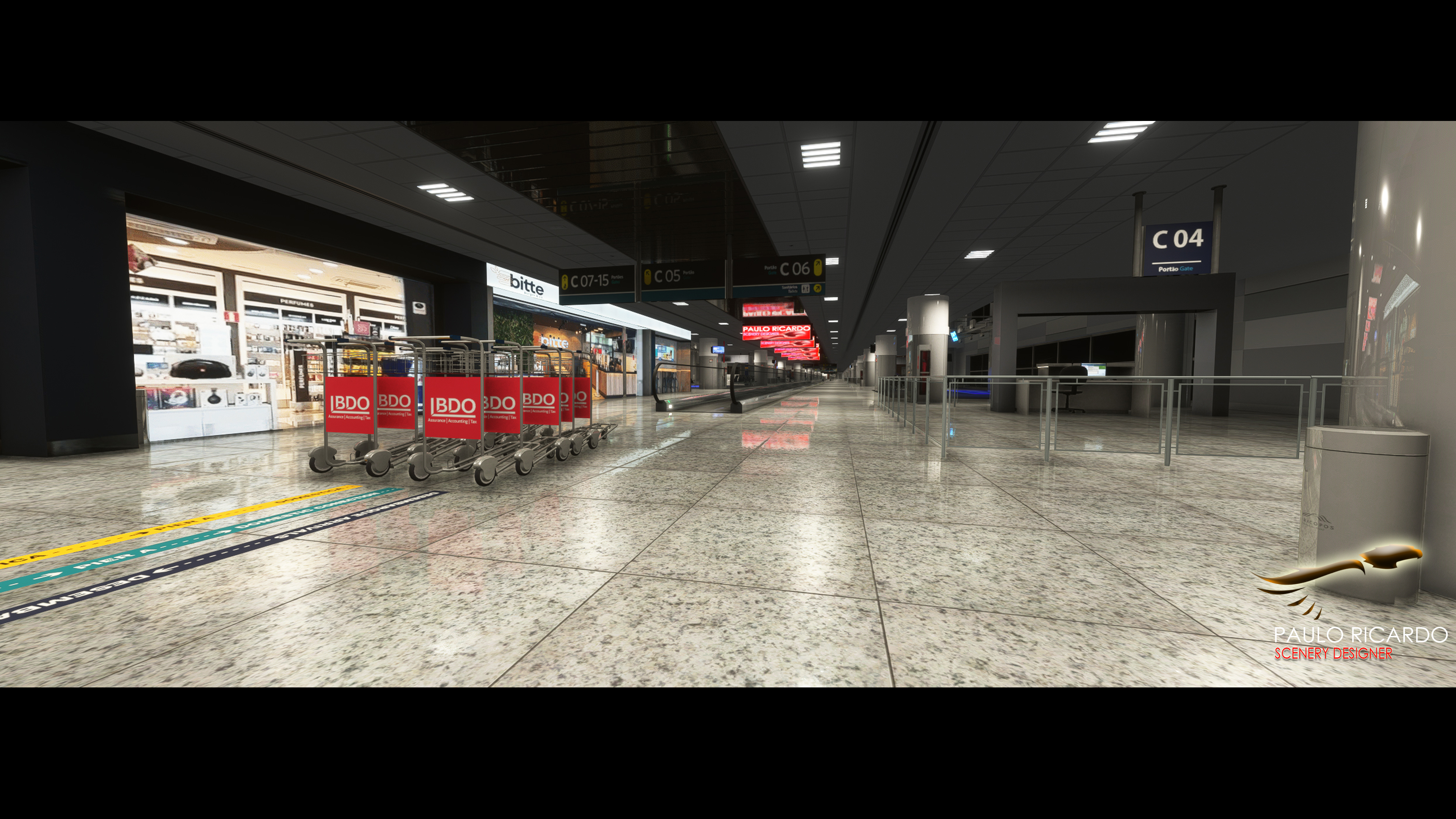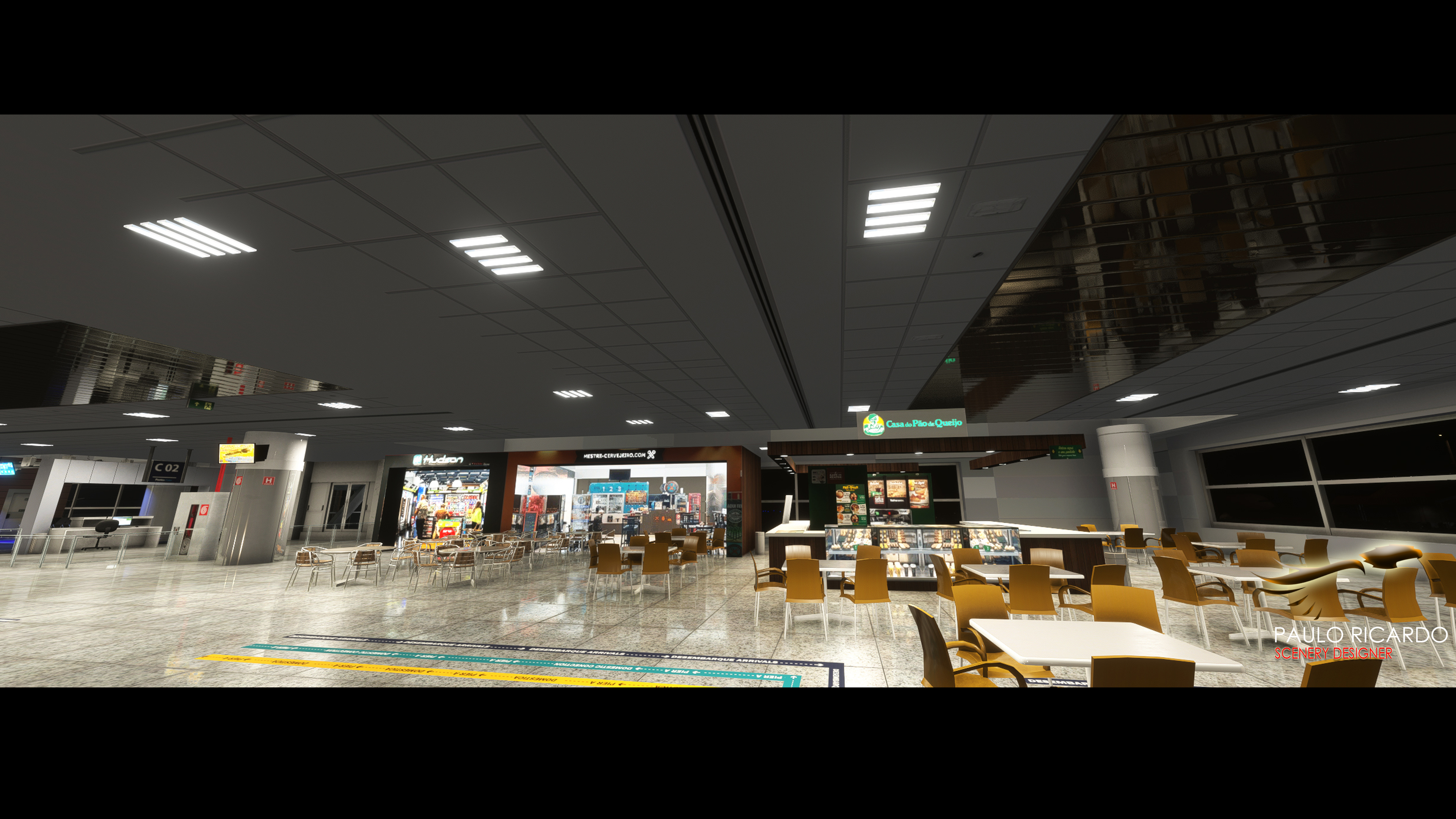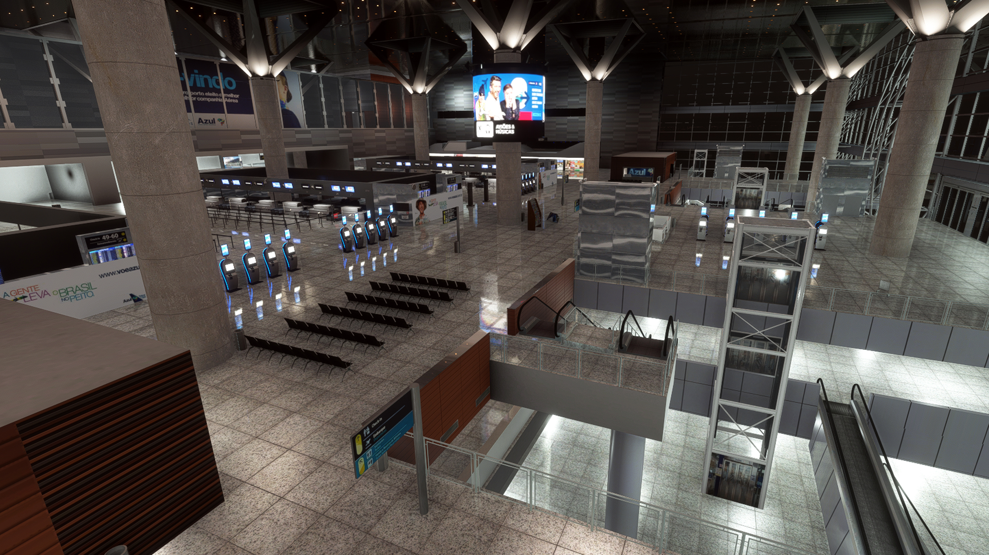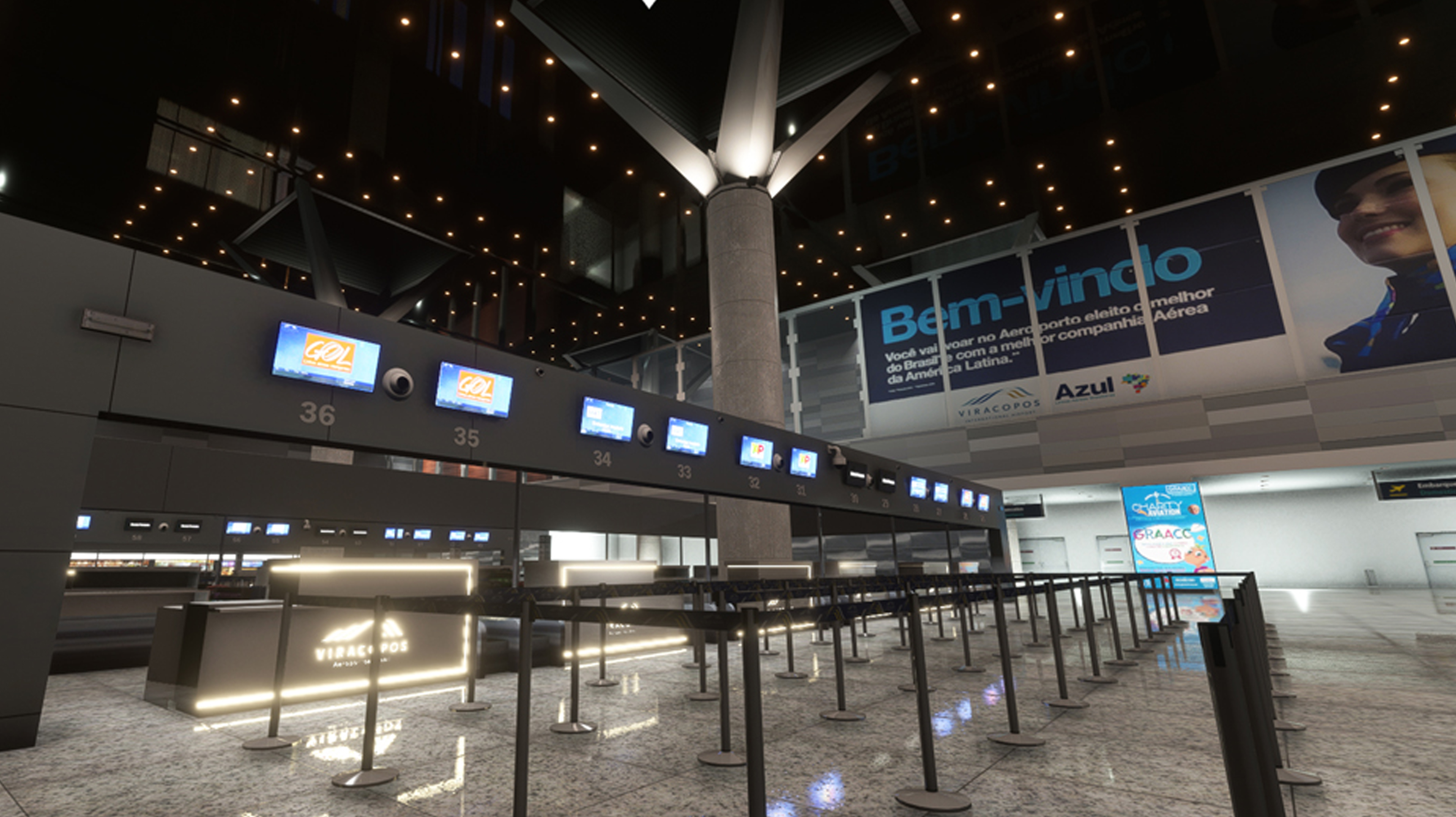 The scenery features a highly accurate rendition of the airport and the surrounding city (Campinas), with a fully modeled passenger terminal and its interior, custom ground markings, landside buildings, custom ground clutter, custom night lighting, a realistic depiction of the internal layout with all of the shops as per real life, multiple POIs, and more.