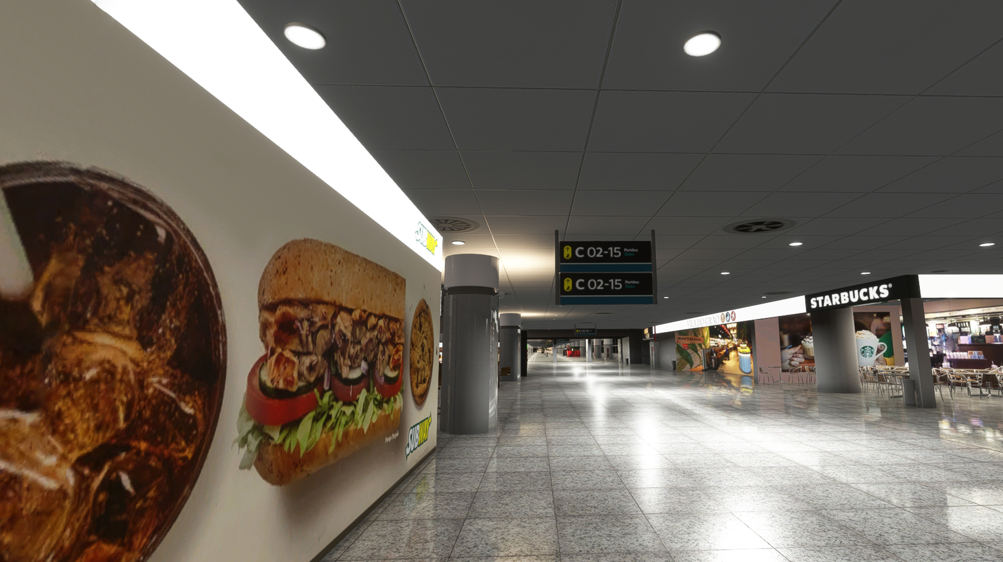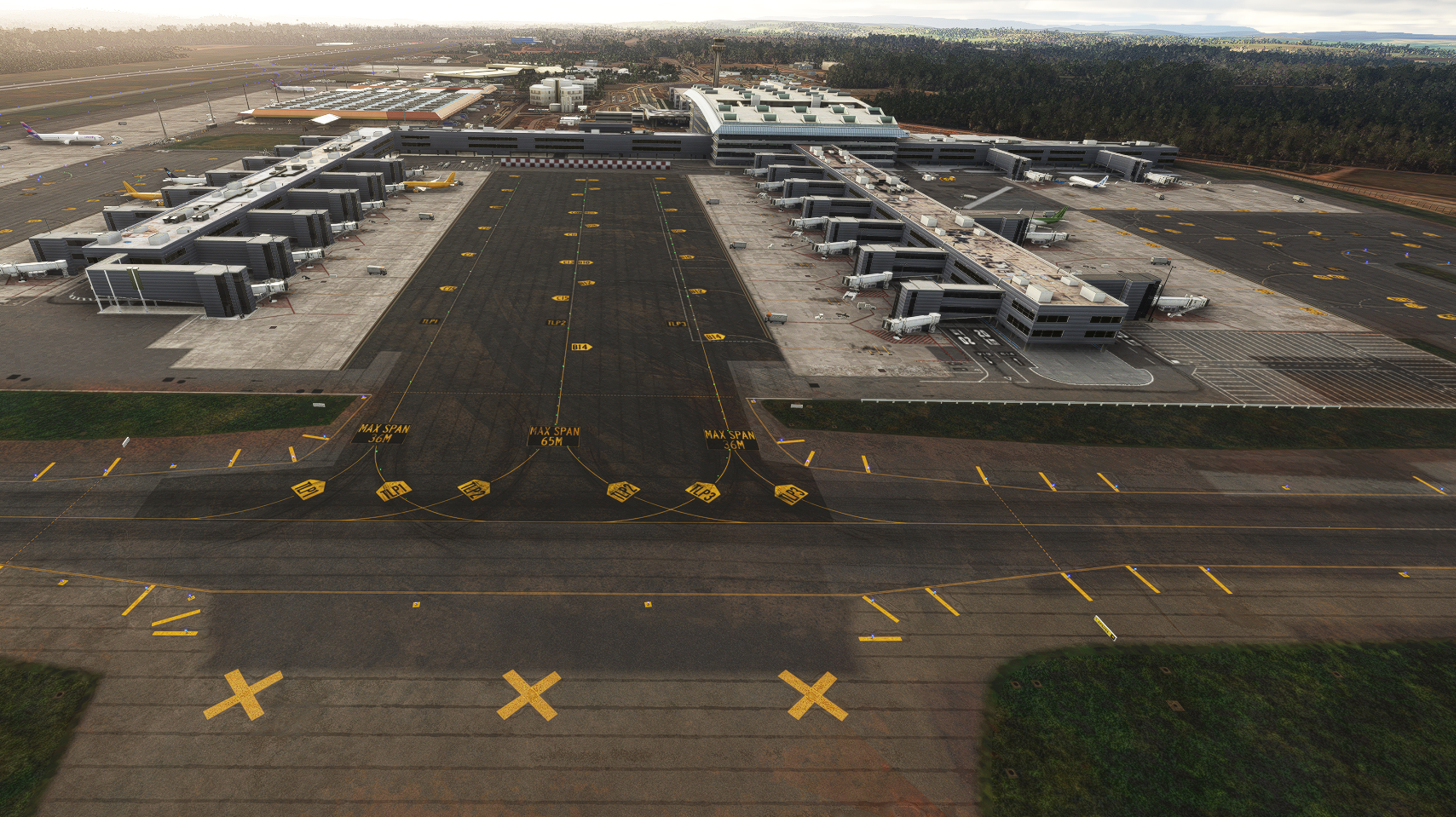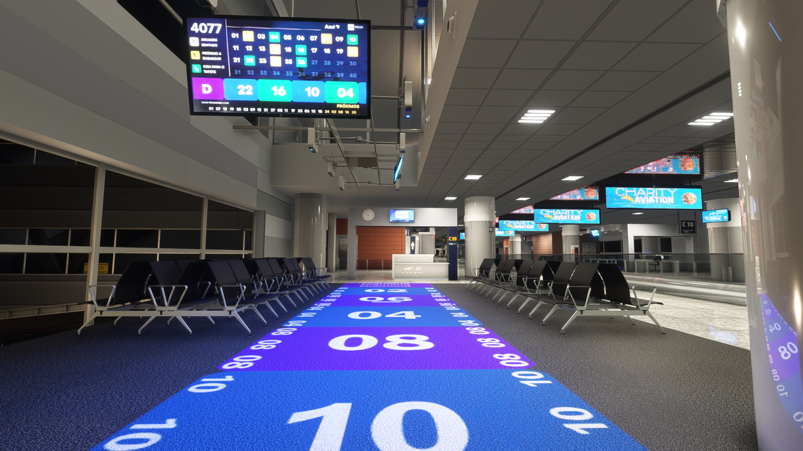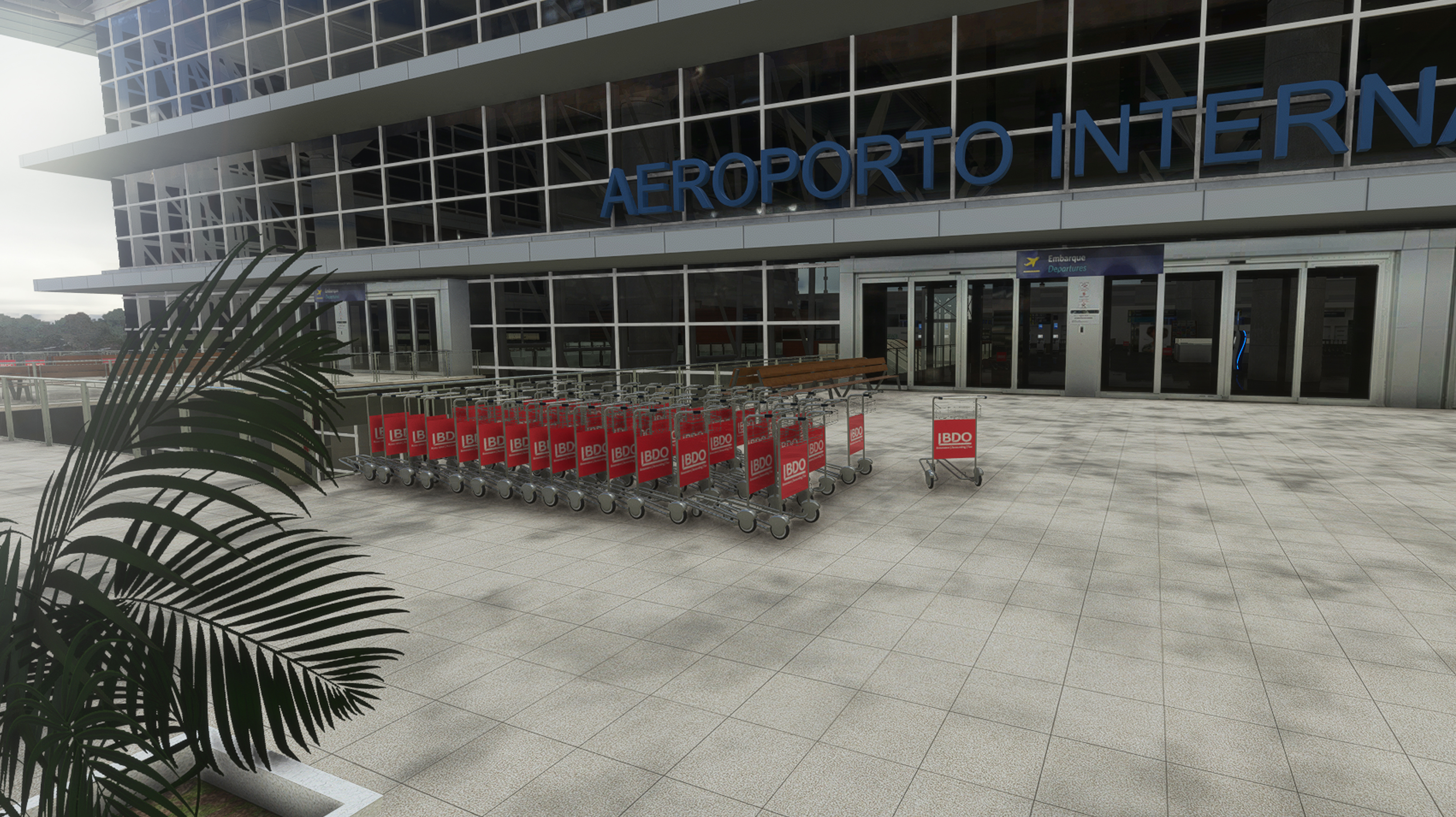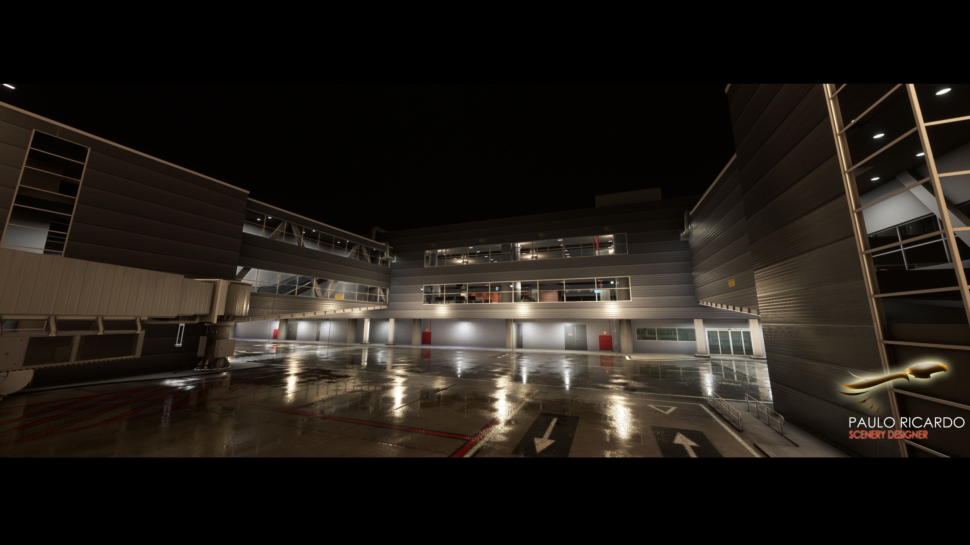 The scenery features a highly accurate rendition of the airport and the surrounding city (Campinas), with a fully modeled passenger terminal and its interior, custom ground markings, landside buildings, custom ground clutter, custom night lighting, a realistic depiction of the internal layout with all of the shops as per real life, multiple POIs, and more.