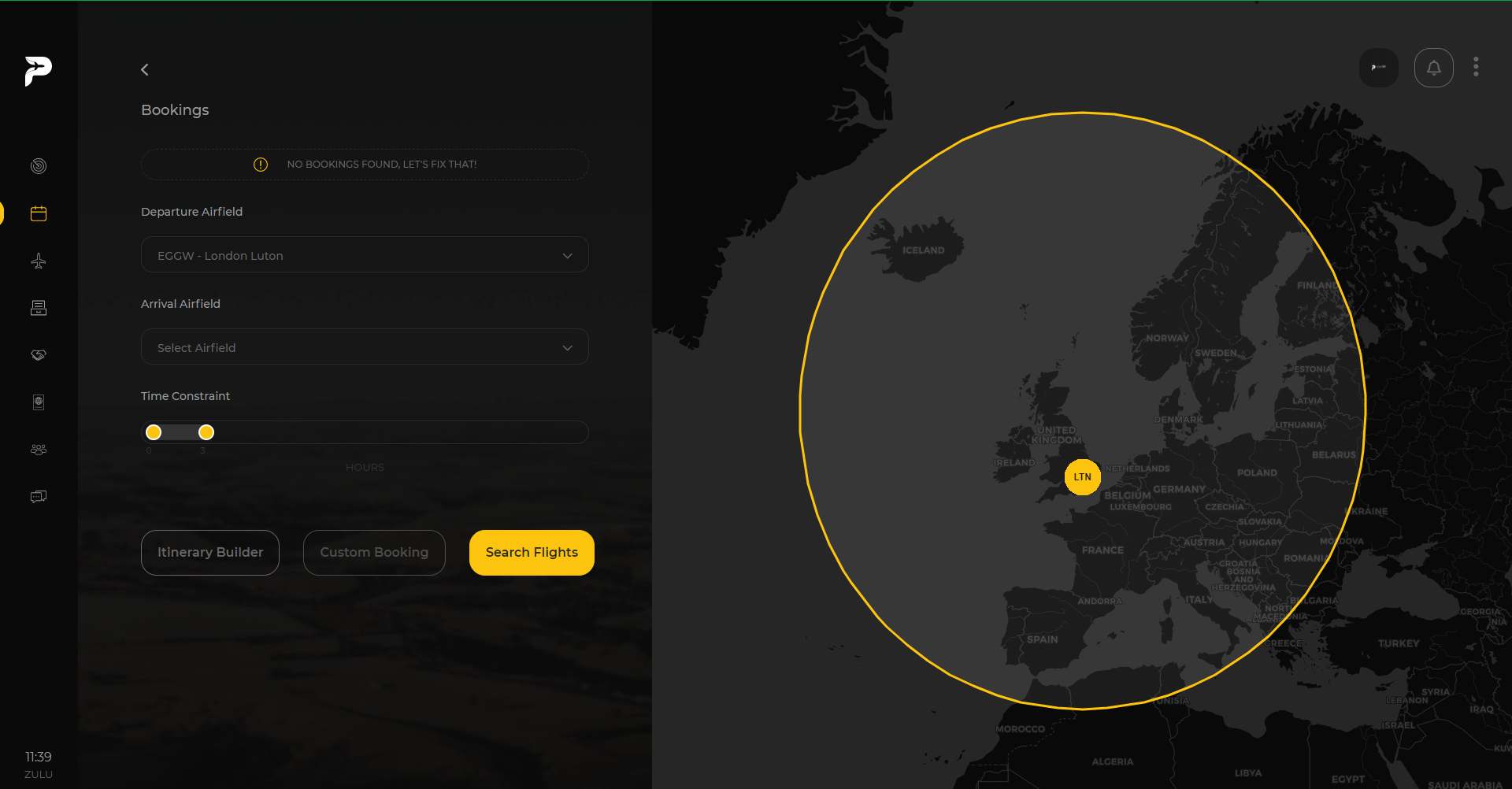 “Lastly, we have the new Bookings page. From here, as usual, you’ll be able to type in a Departure and Arrival Airfield and search through the projectFLY schedules. From here, you’ll also be able to access the Itinerary Builder or create a Custom Booking, if that’s how you roll. Now, let’s say your craving some flight time under your belt, but you’re running a bit short on time. We’ve introduced a new “Time Constraint” feature. Just type in the Departure Airfield and choose your constraint and the map will show you a circle of airports you can fly to within the time that suits you best!