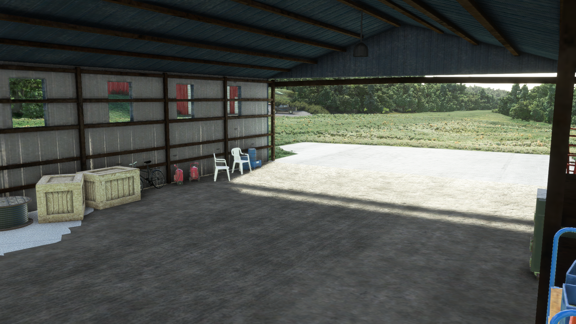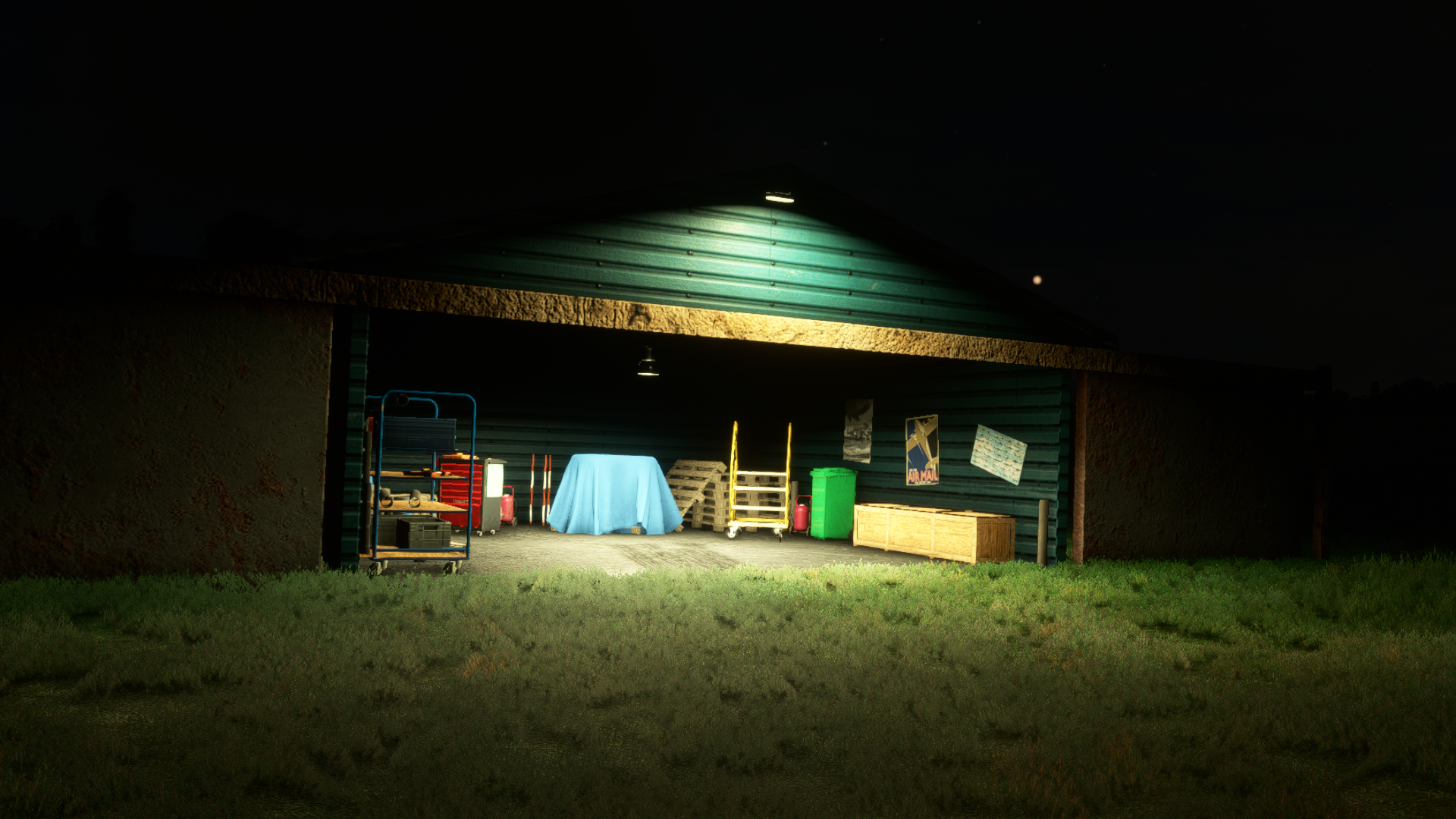 The scenery features a high-detail rendition of the airport as it stands, with PBR materials, 4K textures with 2K complementary textures, a sloped runway with bumps, modeled interiors for the hangars with one spawn point in one of them, and night lighting.