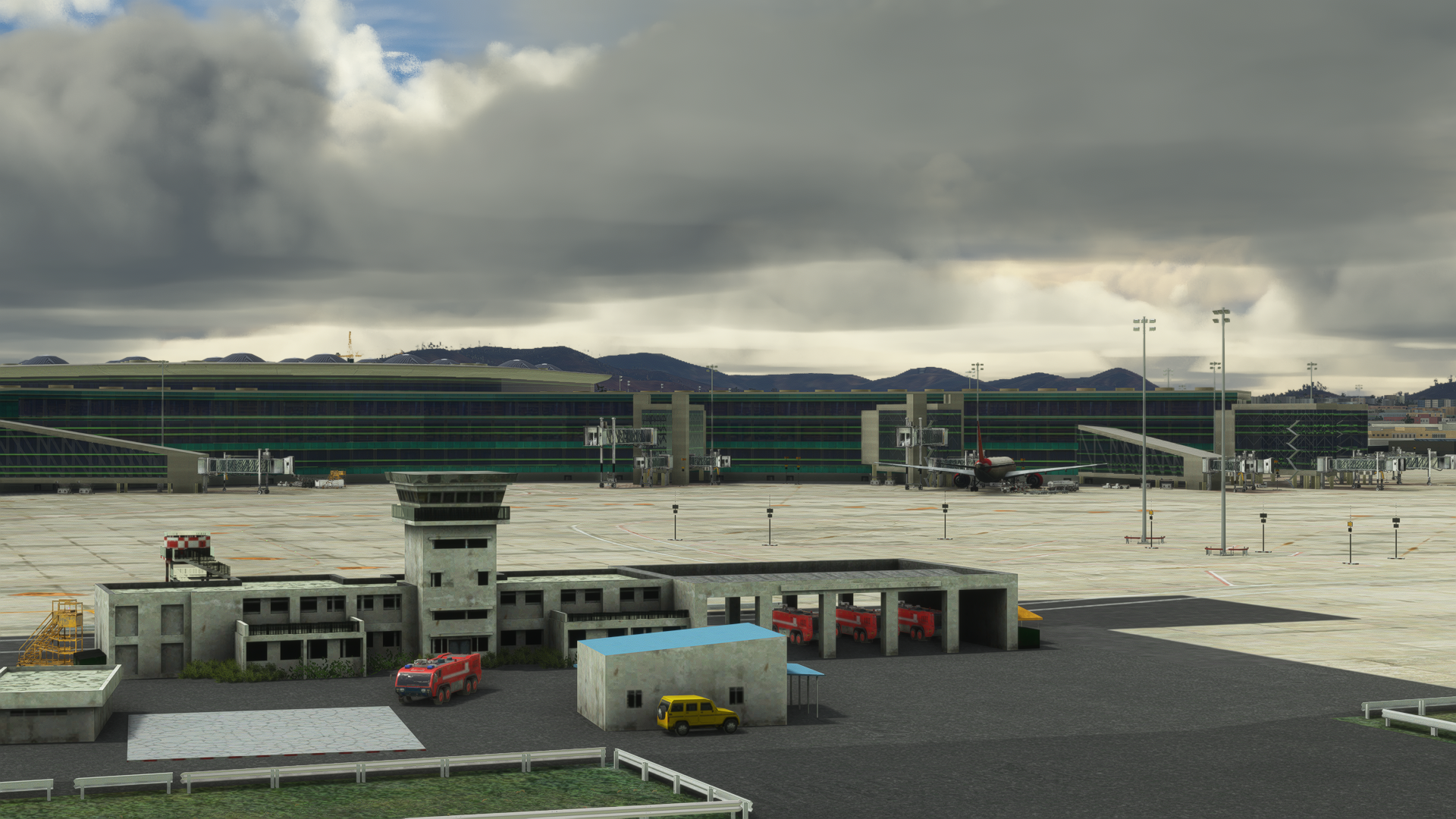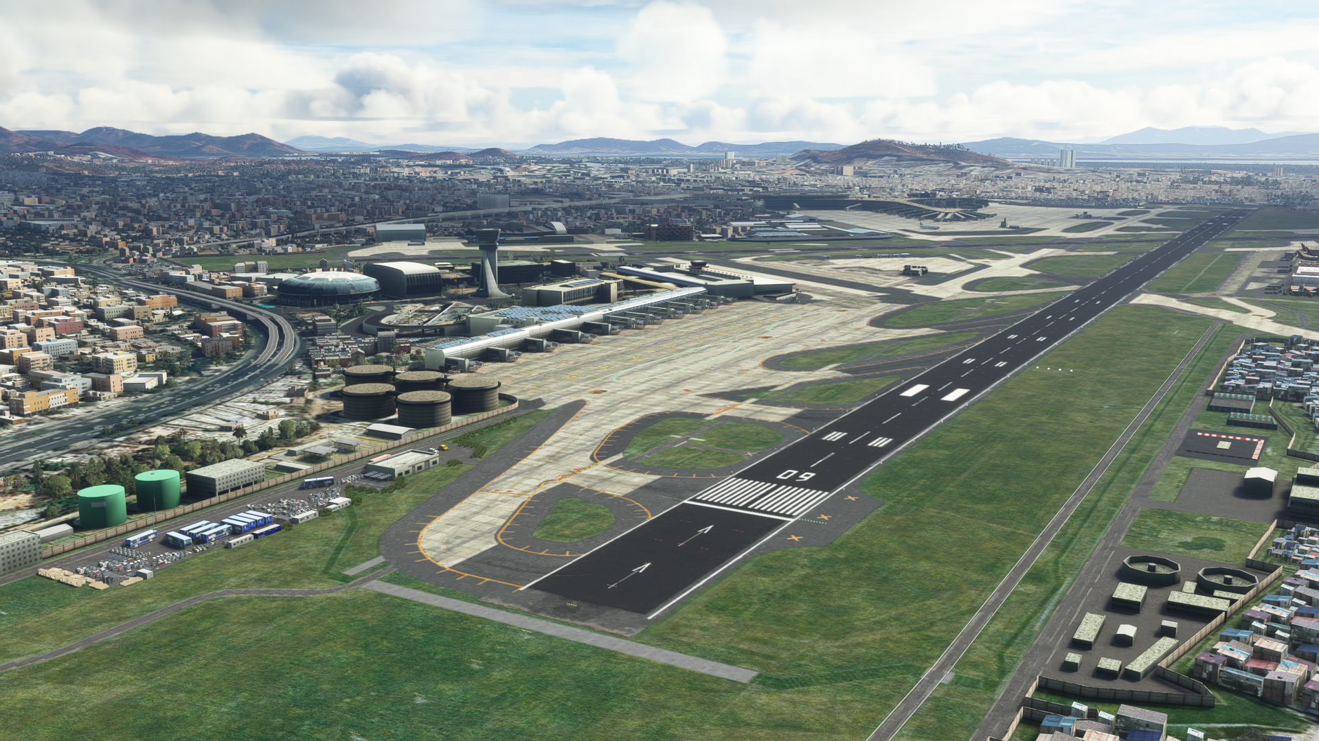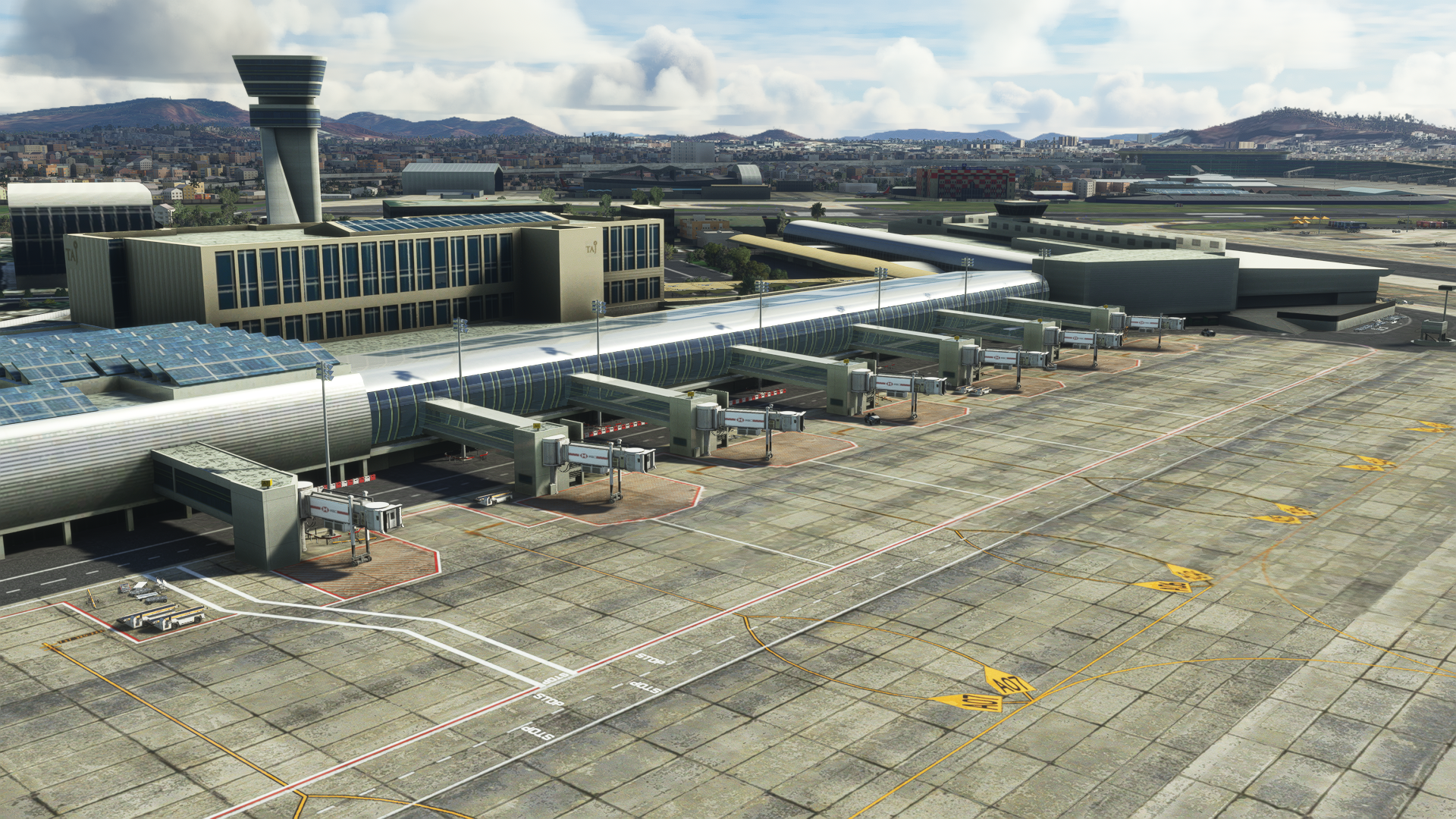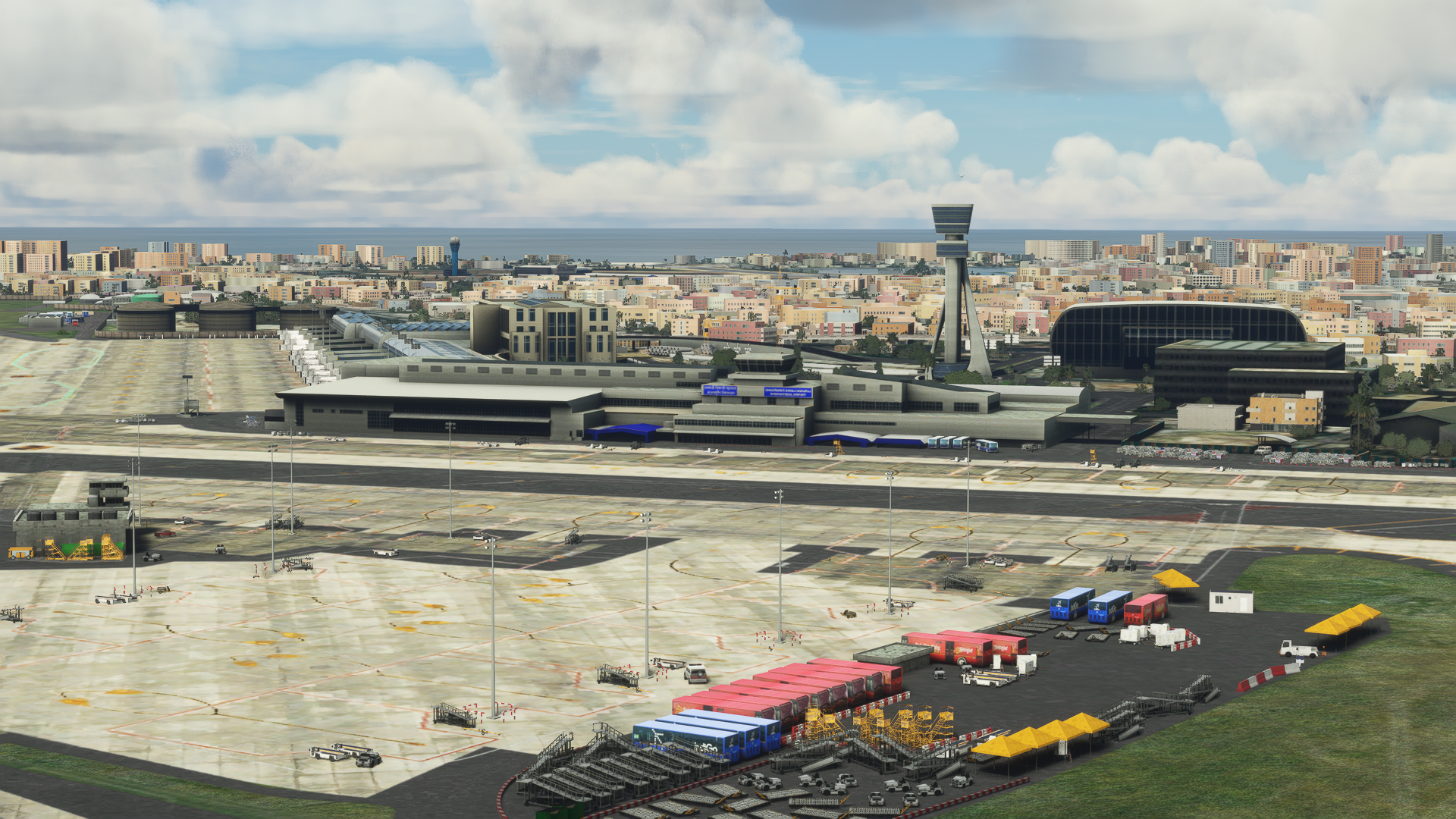 The scenery features a detailed 3D model for the terminals, buildings, props, and landside buildings, detailed ground poly, custom ground markings, a detailed terminal interior, high-detail airside with ground service equipment and static aircraft, specular mapping and PBR on ground poly, dense fps-friendly custom autogen, bonus 3D scenery of VAJJ, night textures, and custom AFCAD.