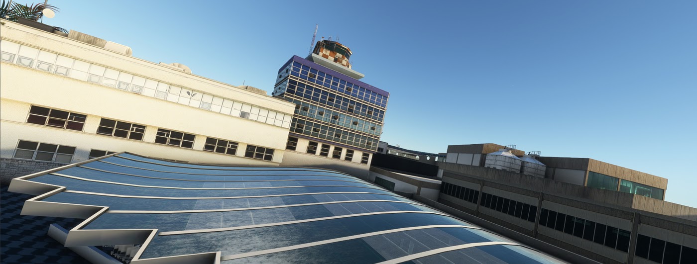 The scenery features an accurate rendition of the airport, with custom ground textures, custom jetways, true-to-life landside, multiple city landmarks, a detailed terminal interior, custom ground clutter, custom weathering, and more.