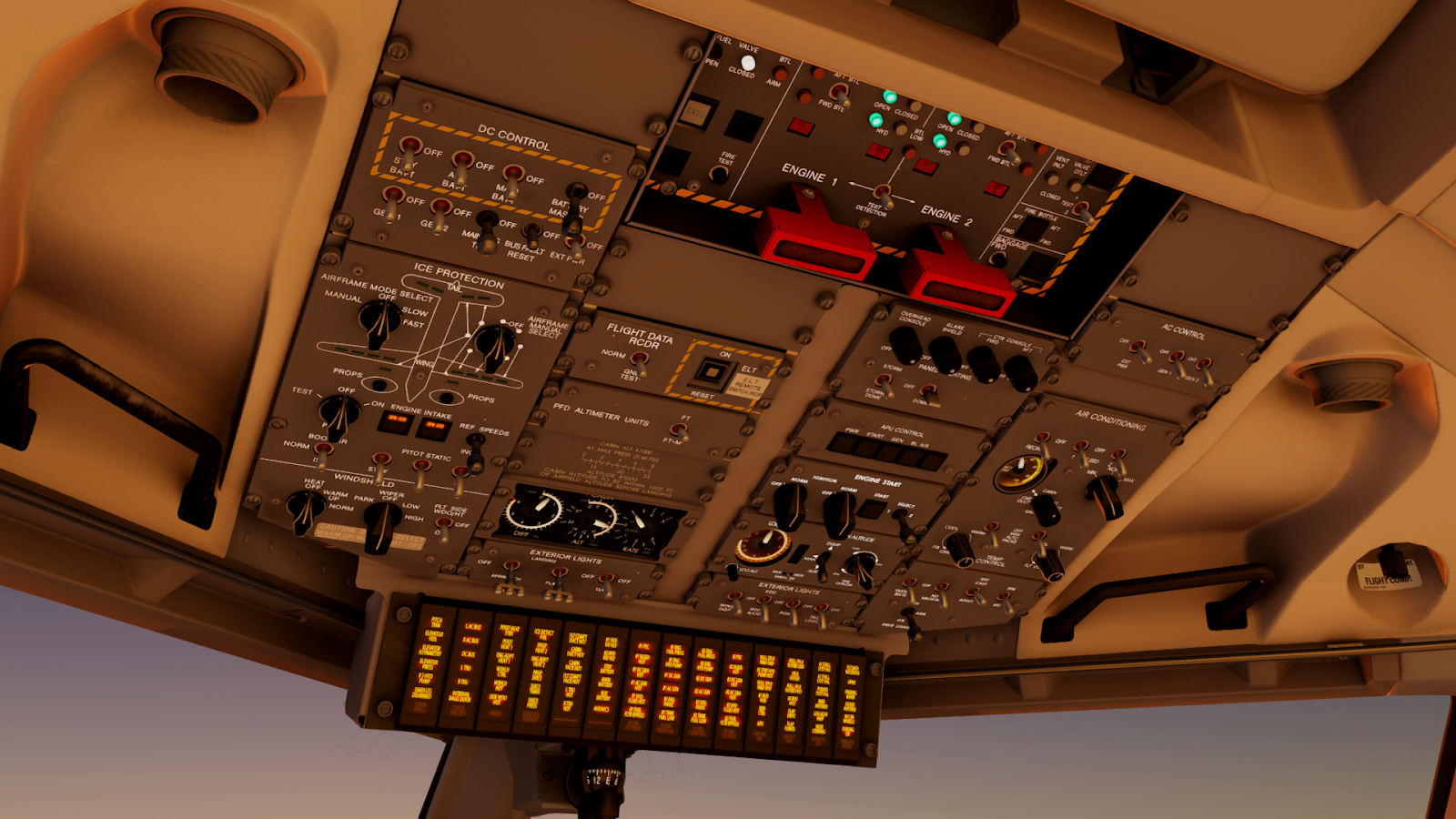 Further discovering the cockpit, I want to focus on the Overhead Panel and CWP (Caution Warning Panel). The top left side of the overhead panel is home to everything electrical and power. Further down we can find the ice protection panel, this is vital for pilots to keep an eye on when flying through clouds or in high precipitation situations. Finally, on the left side, we can find the windshield panel; which can control the wipers for both the pilot and copilot.