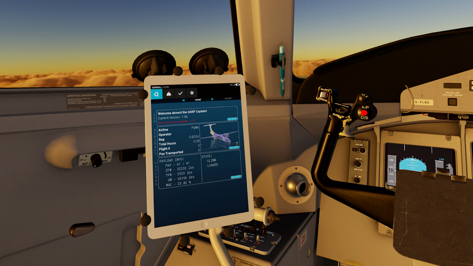 The final part of the flawless cockpit is the convenient JPad. In line with the extreme detail in the aircraft, the team have poured many hours of work into their JPad. The Q4XP’s EFB comes equipped with 4 menus: General/Home, Payload, Checklists and Settings.