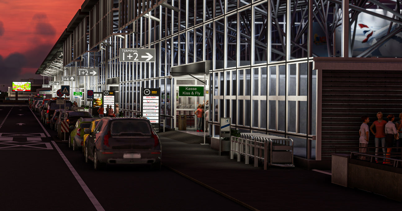 The scenery features an accurate rendition of the airport, with animated jetways, custom models, PBR texturing, a custom interior with 3D passengers, more than a thousand clutter objects around the apron and surroundings, custom ground textures, performance-friendly optimization, accurate night lighting, custom taxiway signage, ground traffic, and more.