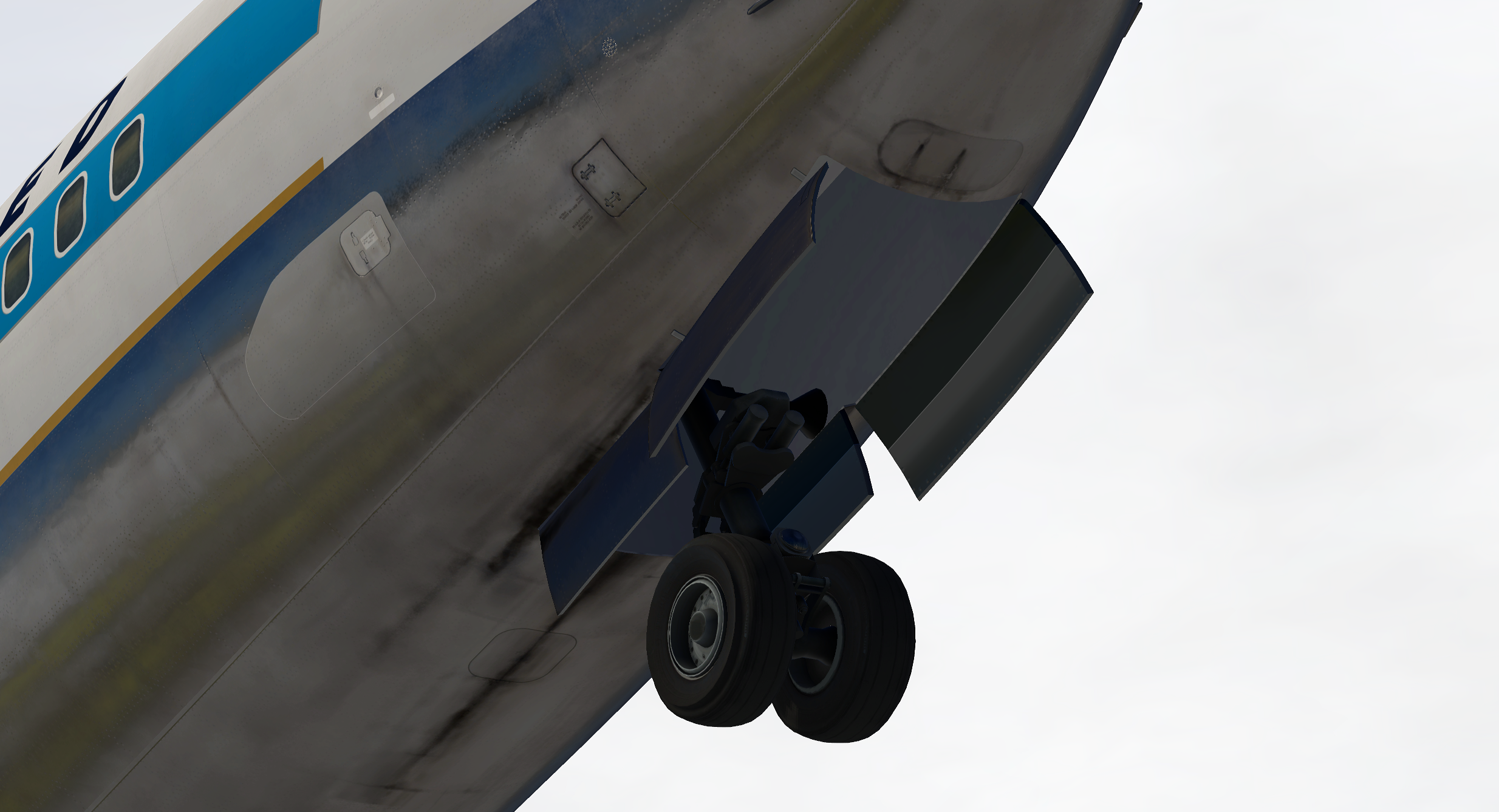 The gear well and landing gear themself are also modeled in a very basic way as well. In the real world the 727 has piping, wiring, fluid storage tanks, and other systems in the gear well. None of this is modeled… The only thing that we do get are photographs of these systems overlaid on the walls of the gear well. In this case, the gear well is closer to an art gallery than an actual 727 gear well so don’t expect modeling detail. The gear doors also lack the pieces and parts that allow them to open and close. Similar to the situation that we had with the slats, it looks a little funny because the doors appear to be just hanging freely.