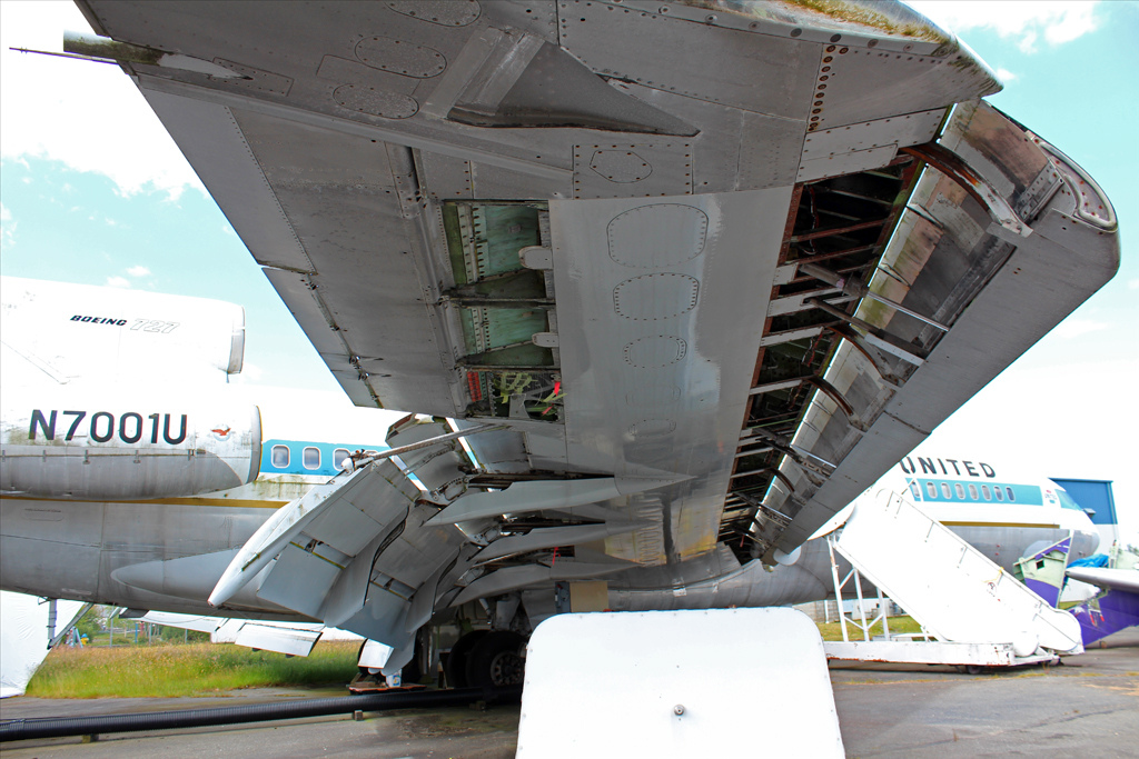 The “slat well” appears to be modeled in a rather basic manner. The inboard slats (Krueger flaps) are divided into three rectangles, the two innermost pieces have curved, retractable tips, whilst the outermost rectangle of the inboard slats doesn’t have a retractable tip; as a result, the slot for the outermost bar has a different shape than the innermost slat pieces. Again, this could be an X-Plane limitation, but it is unfortunate that these visual cues on the 727 are not shown in better detail.