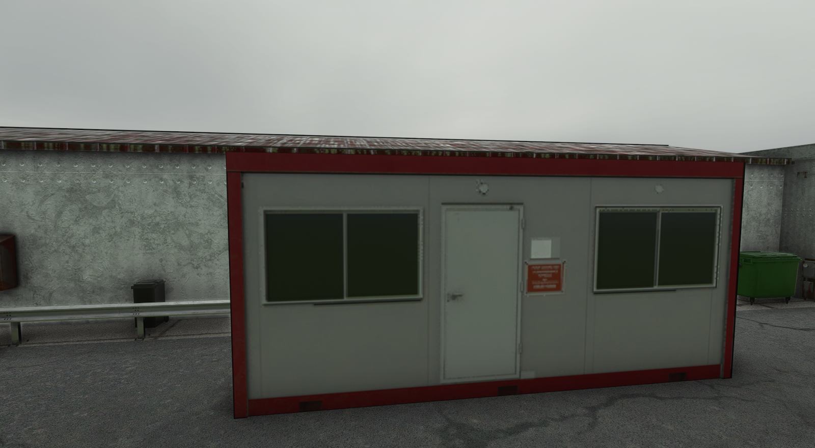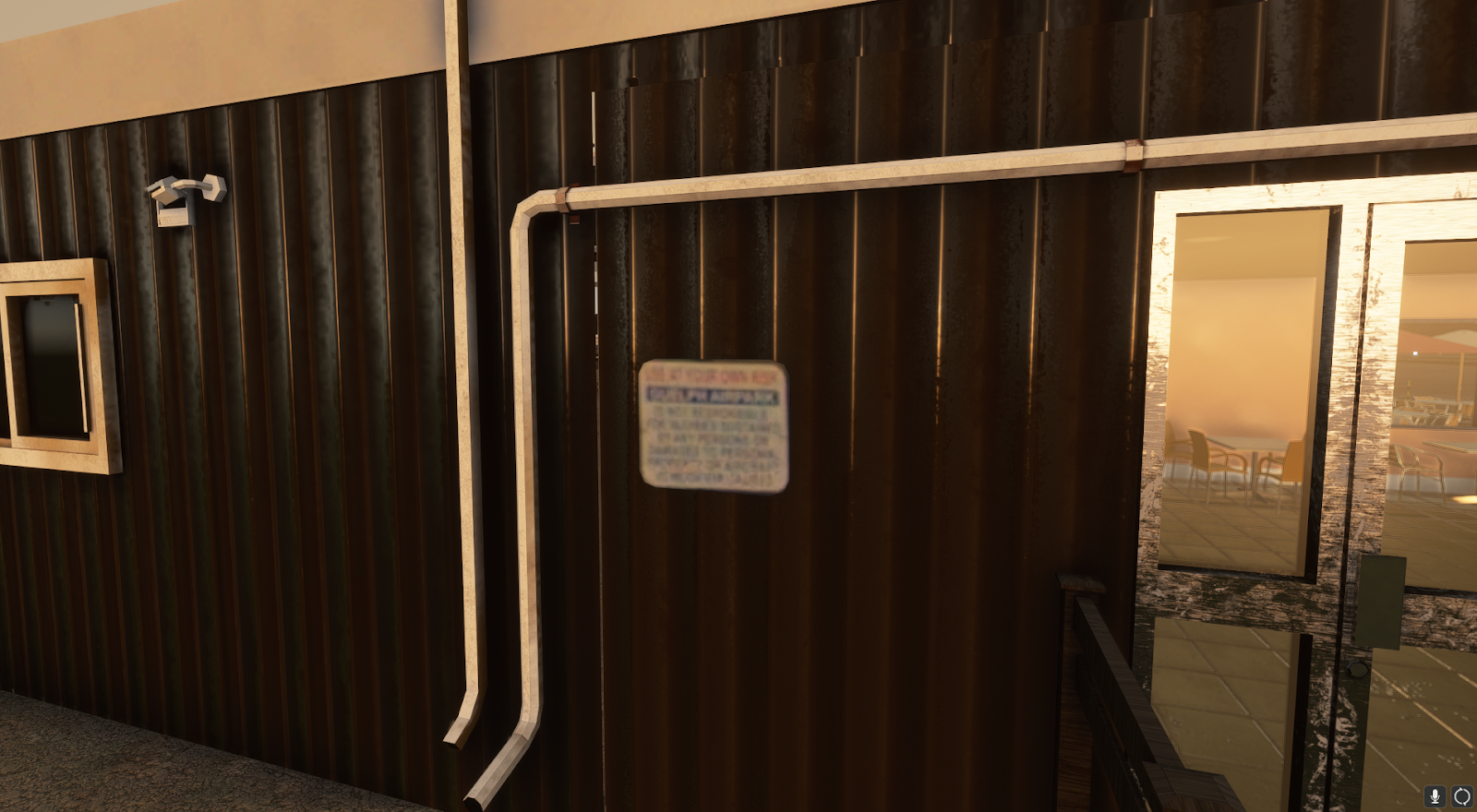 Starting with texturing, the general resolution of the textures could be higher quality. In various areas, the texturing is of a noticeably low resolution in certain areas which can make the buildings look blurry or give off the impression that they lack detail. A prime example of this is the smaller building pictured below. The textures are low-resolution and flat and don’t provide any depth. As well, while some text is perfectly readable, in other places the text is so blurry that It’s completely unreadable. Considering how detailed graphics can get within Microsoft Flight Simulator, I’m pretty sure It’s possible to get the text that small readable. Although I’m being a bit nitpicky, it’s stuff such as readable text which truly enhances the scenery and impresses me. There’s also a weird metallic look on a certain building which can look passable at day, but during golden hour and beyond it suffers a weird reflection which almost makes it look like plastic (viewable below). Other locations of the airport suffer the same issue, especially the main terminal where the textures could be afforded higher resolution and the walls look blurry up close, once you get a bit further from them, however, they look completely passable. I also noticed a small hole in the wall of the main terminal, although It isn’t huge and wouldn’t be noticeable during normal flight operations, It’s like to see fixed. If I had to pinpoint a single word to describe the texturing of the aerodrome, It’d have to be inconsistent. In some areas, the texturing is uninspiring, while in others It’s done decently well. The fences, lighting poles, and other areas such as some of the hangars are done to a high standard, and some areas such as guard rails are textured well-enough that even the nuts and bolts are visible. However, much of the airport doesn’t get the same treatment, with some walls getting close to no detail, it makes me wonder why some areas of the airport are much higher quality than others. So in conclusion, I can’t specifically say if the texturing, in general, is done well, It’s just not consistent. In some areas, the texturing is well done and in others, It’s subpar, the textures are truly a varied experience for this aerodrome. Moving on to modelling, it seems to be more consistent and is done pretty well. Although judging models is much harder than textures, I didn’t notice any major issues which took away the experience and all buildings look like they represent their real-life counterparts well. I did notice some issues though, the smokestacks on the left part of the terminal were floating. Although this isn’t noticeable when flying regularly, I did spot the issue pretty quickly while moving around in drone camera and looking for irregularities. Another error in the modelling is a window frame near the café, which in real life contained three separate window panes put into one, the window in sim only contained two. Of course, these were only minor issues I found, and in no-way took away from the experience of the airport. In general, the inclusion of various little details are modelled well, such as the guard rails, light posts, garbage cans, and more. I’d definitely say that the modelling is well-done for the airport’s asking price of 5 euros.