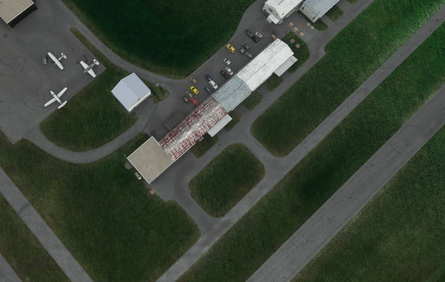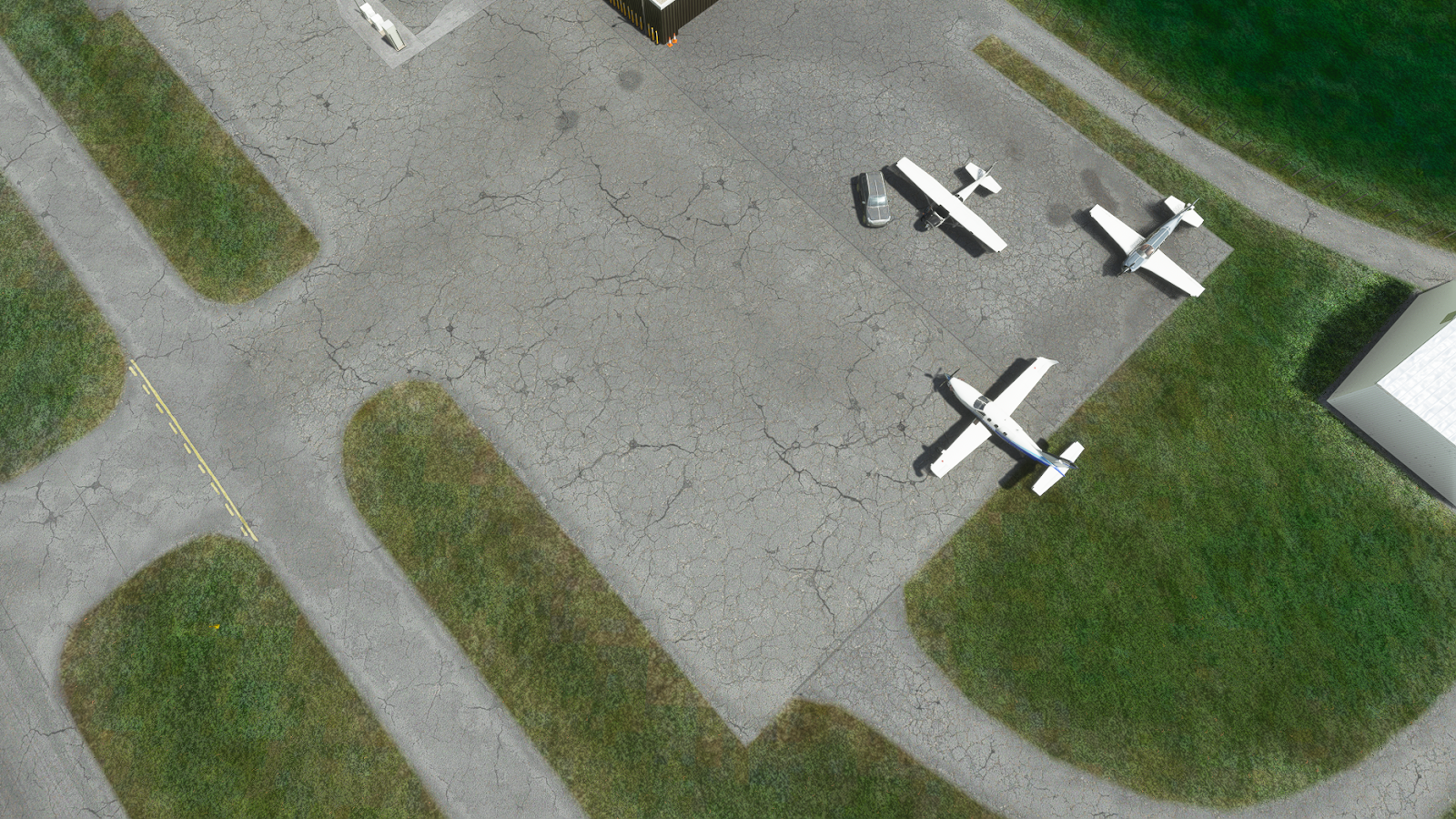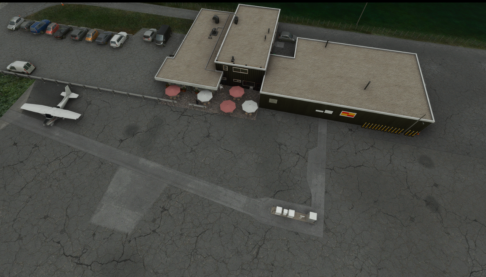 Initially loading into Guelph I was quite impressed with the quality of the scenery, especially considering its price tag of 5 euros. Upon loading in, I entered the drone camera and flew around the airport which allowed me to notice numerous minor details which were quite appreciated. For example, RegDesigns had modelled the interior of multiple hangars with their doors open, inside, I was able to find various screws and tools, all laid neatly in boxes or on shelves, along with further minor details. Moving to the airpark café, I was quite happy to see that part of the interior was modelled. Although the whole interior wasn’t modelled, the cafe’s seating area was, which is the only area viewable from outside. I did notice some issues though, particularly with the colouring of the wood being off compared to source photos I found, although that could have been due to worn-out paint. The developer also included a couple of people lounging in the chairs of the café, although it looked a bit off due to their aviation headsets still being on, It would’ve been nice to see more people sitting at the café to make the aerodrome feel more alive. The rest of the main terminal seemed to be modelled reasonably well, although I did notice an issue with some windows, which I’ll dive deeper into later. The fuel pumps were modelled incredibly however and matched the source photos I had perfectly. My main gripe with this scenery on the first impression is the low-resolution textures in some areas, especially with a lot of text being completely unreadable or slightly blurry. Another issue I have is the lack of slope to the ground, with the whole aerodrome being completely flat.