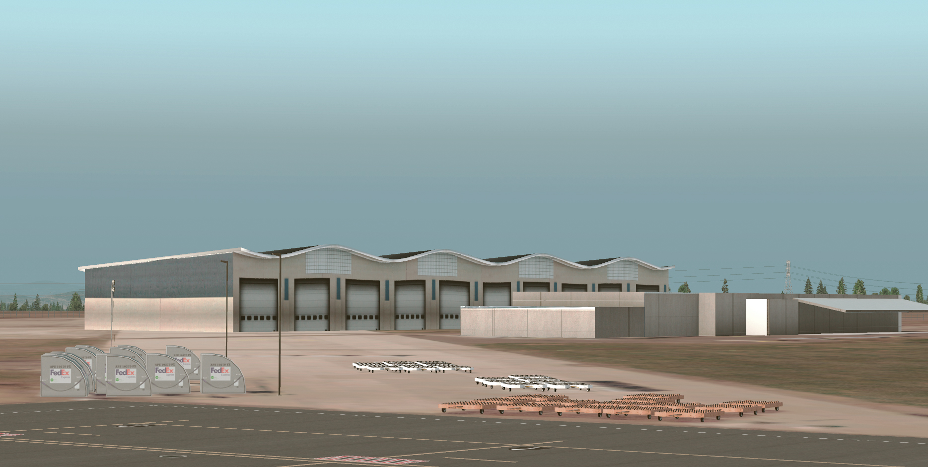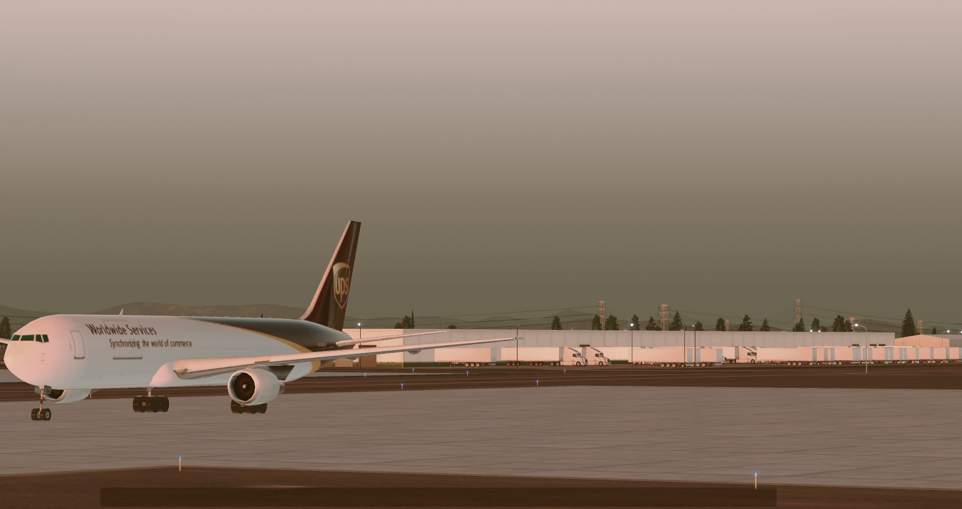 North of the Central GA ramp is the East Air Cargo ramp and with the generated flight plans, there is a parked UPS aircraft. The cargo warehouses and trucks in the distance look great which adds to the scenery quality.