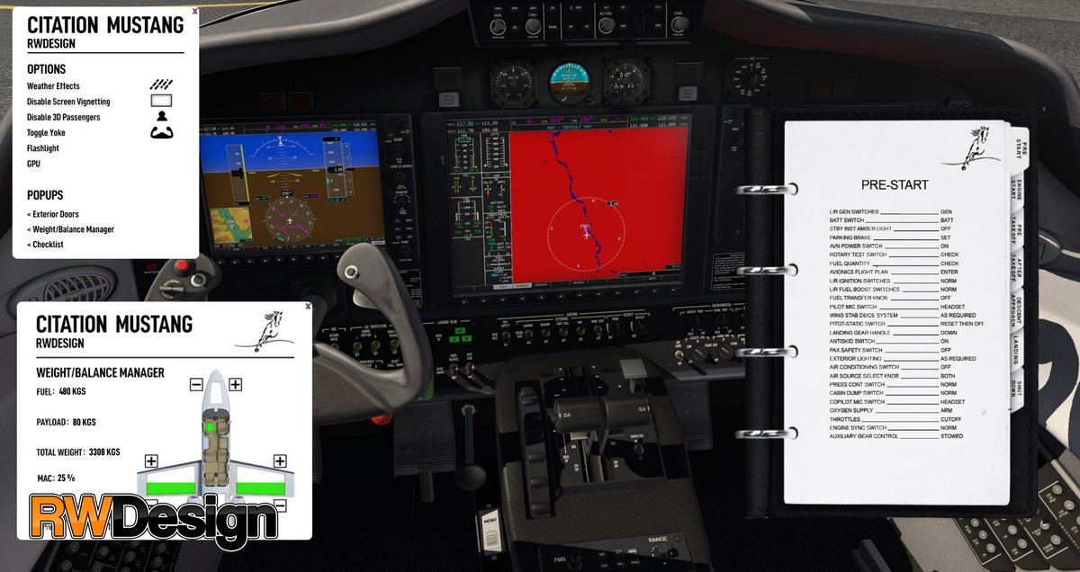 - Superior interaction with the aircraft through scroll wheel support and popups (Multi Checklist, Weight and Balance Manager, MFD Controller, Menu)