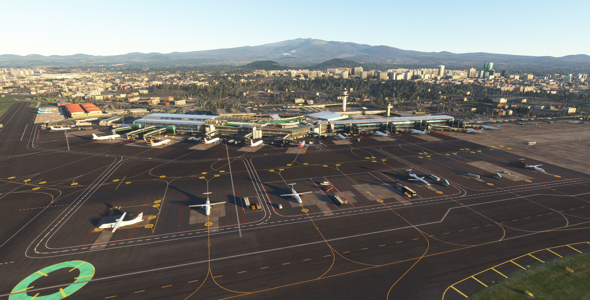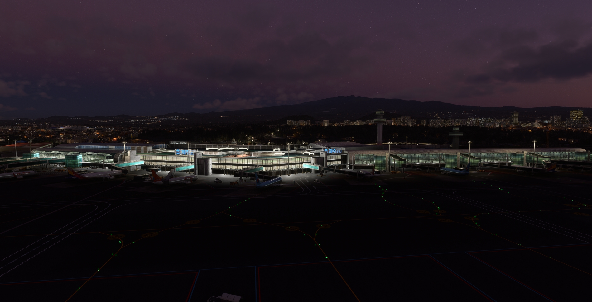 The scenery features an accurate rendition of the airport, with a detailed terminal interior, custom night lighting, a detailed city center, iconic points of interest, custom ground markings, custom jetways, and more.