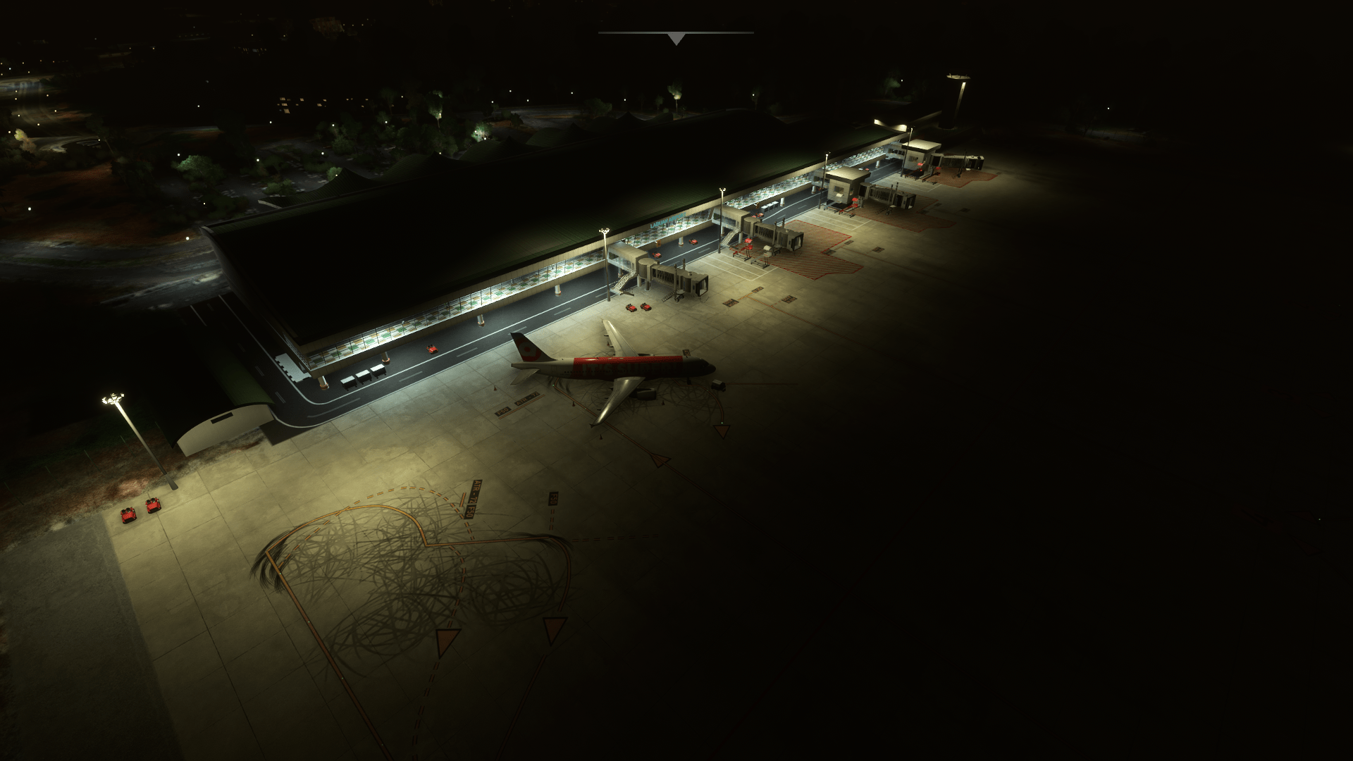 The scenery features an accurate rendition of the airport as it currently stands, with custom terraforming, custom scenery objects, an animated radar tower, moderate terminal interior details, hand-placed taxiways and runway light system, dynamic lighting, and hand-crafted ground markings and textures.