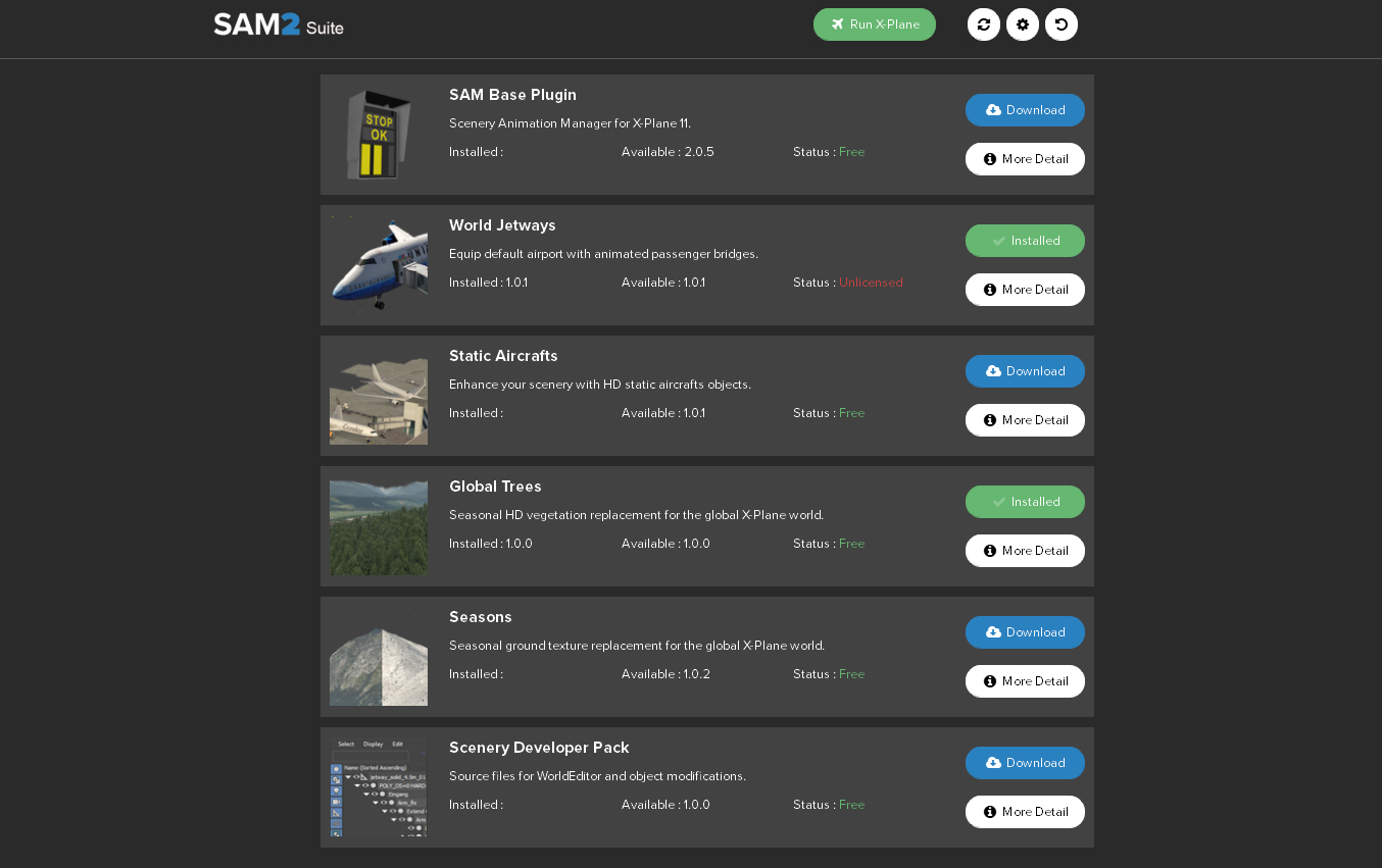 The concept behind the application allows users to install and update all SAM-related products, such as the SAM Base Plugin or World Jetways.