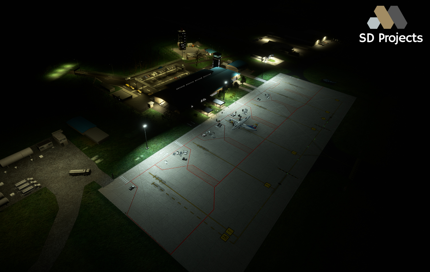 The scenery features an accurate rendition of the airport, with a high-detail 3D model of the main terminal, PBR texturing, custom night lighting, custom ground textures, a true-to-life airport layout, and custom ground clutter.