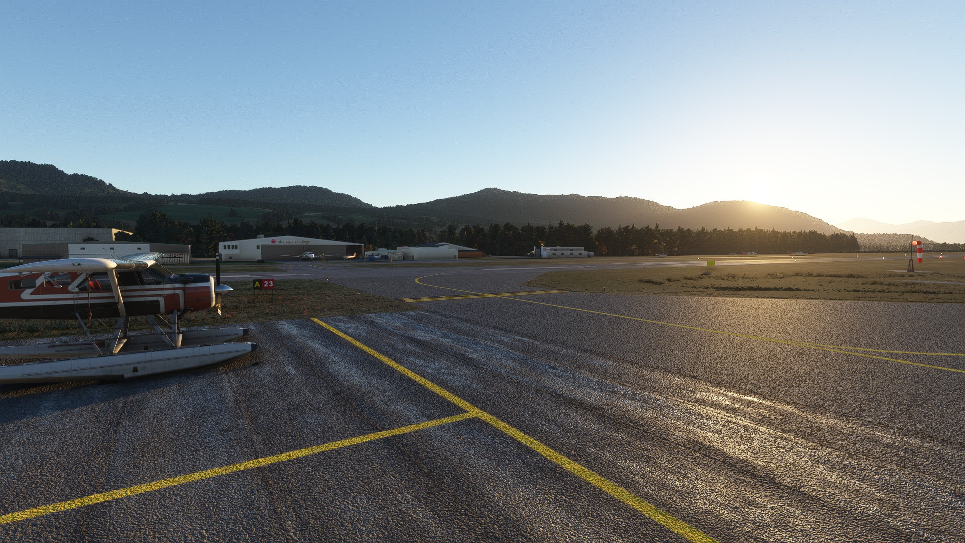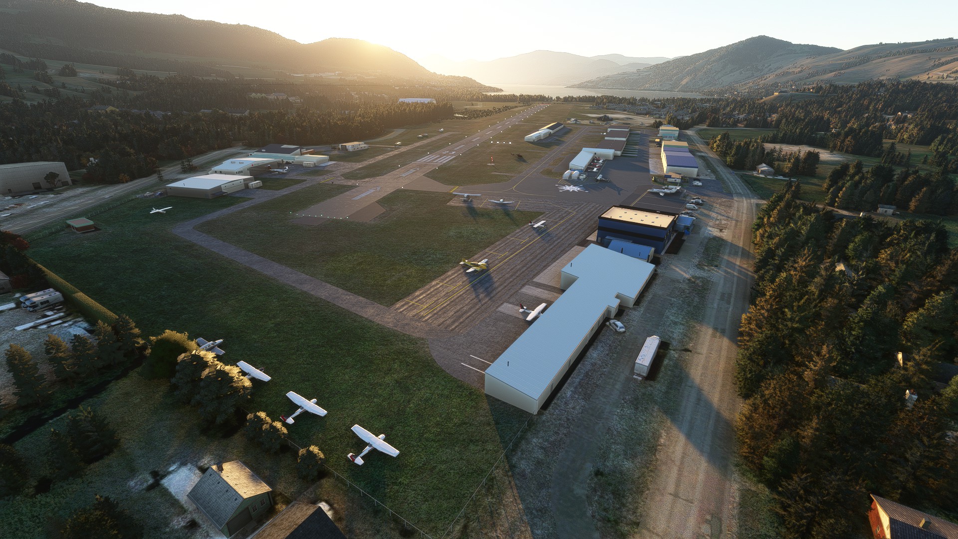 The scenery features over 30 hand-modeled 3D buildings throughout the airport, an accurate replica of the main airport building terminal, the Okanagan College Aerospace Campus hangar, a custom runway with correct aprons & night lighting, multiple static aircraft parked at the right areas, hand-modeled & textured fuel tanks, custom taxiway signs, 4K high-detail PBR textures, and the CYVK rose compass texture on the ground.