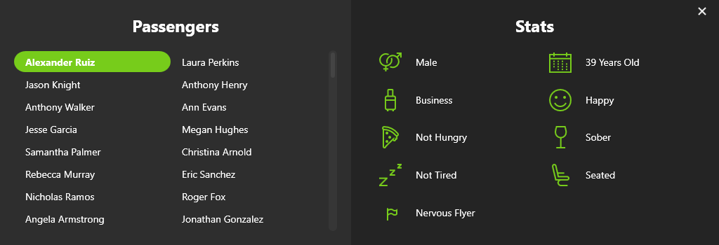 Dynamic per-passenger simulation creates a varied and realistic experience on every flight. Passengers react, in real time, to various events and will have their own unique reactions based on their identities.