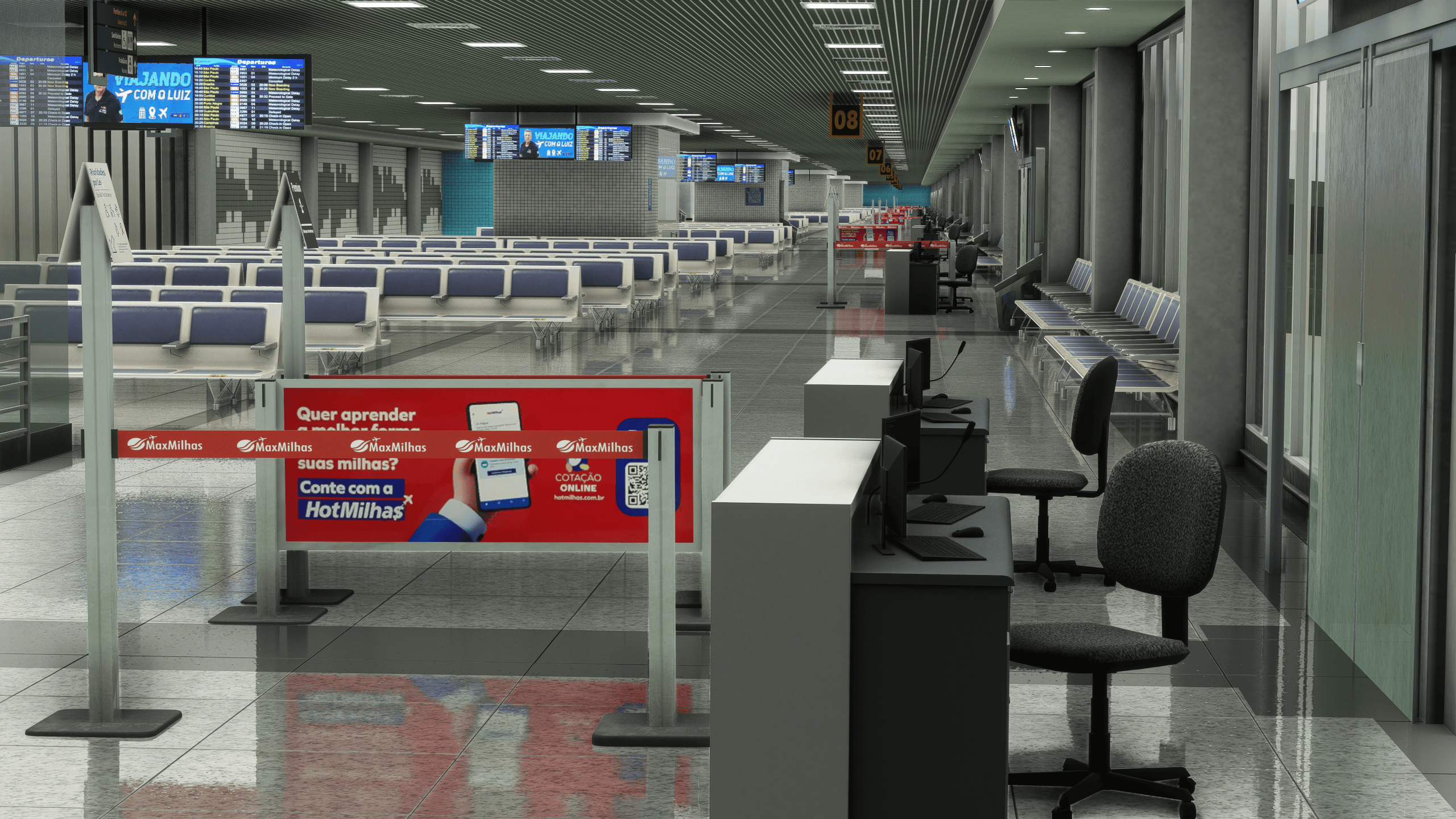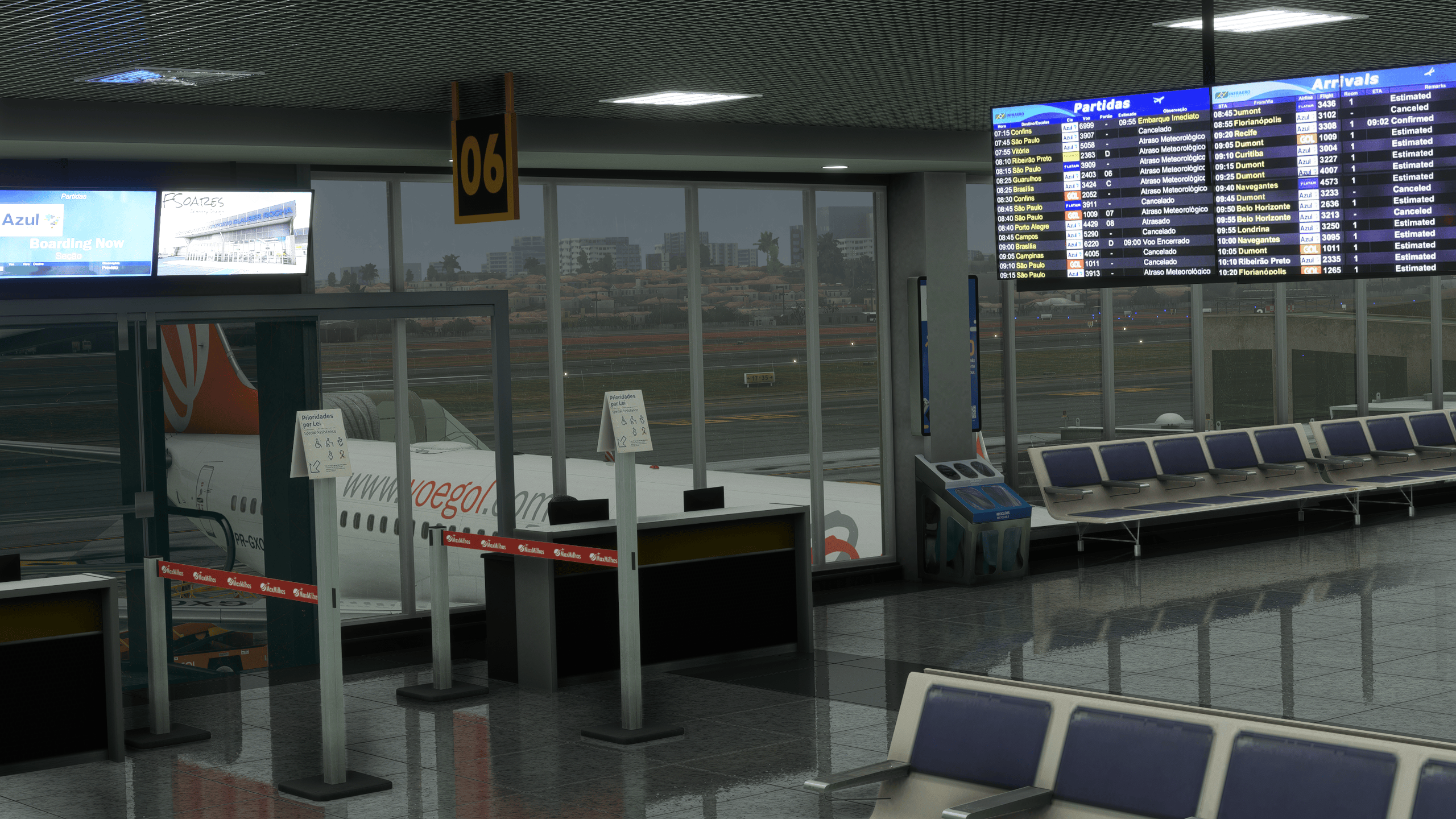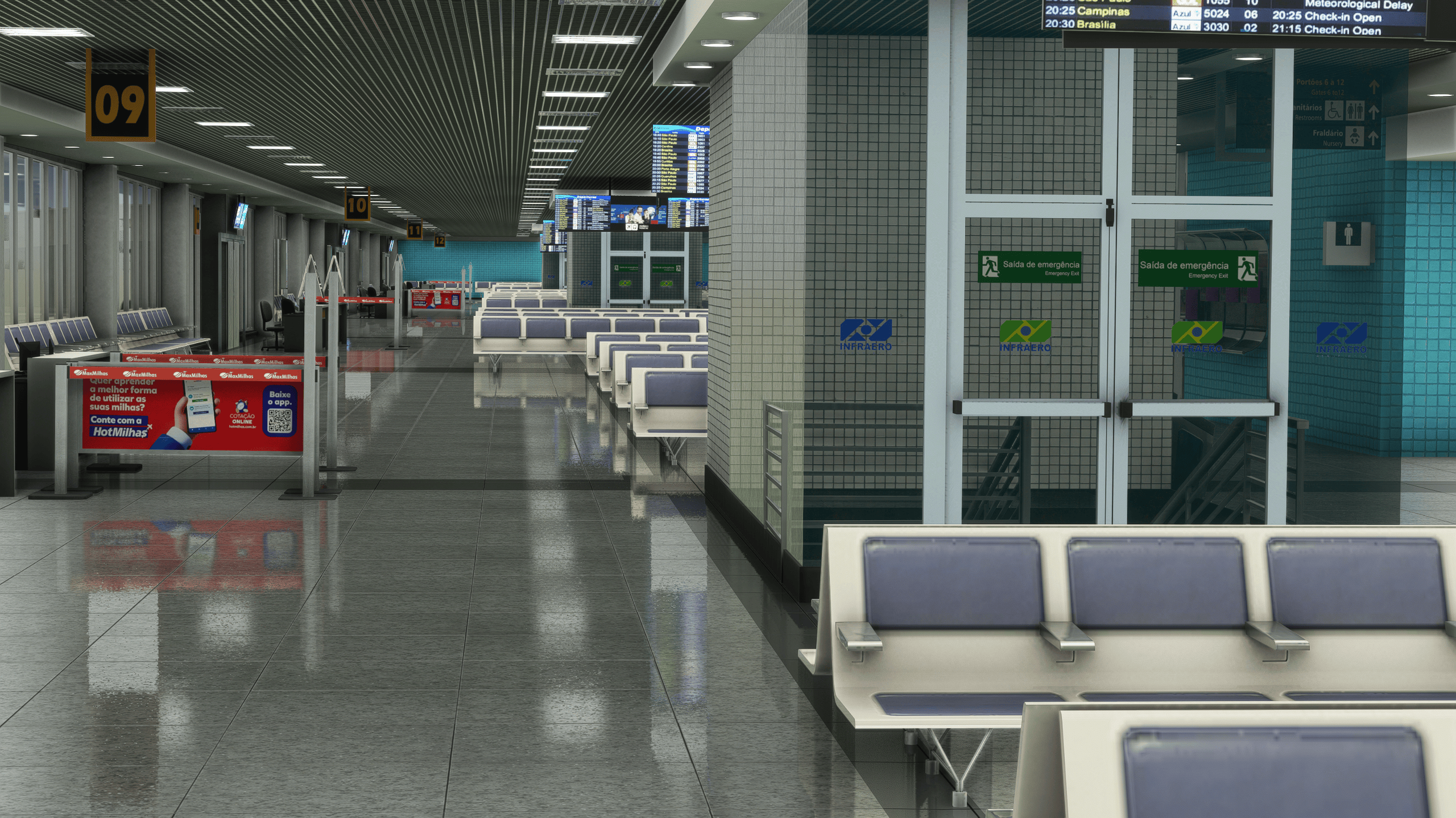 Most, if not all warning signs, stickers, logos, and so on are fully readable and sharp, be it on the airside or inside the terminal, which adds up a lot to the immersion factor. While the terminal interior is not as detailed as his previous work (Viracopos), it’s still impressively good and close to the industry standard, providing an acceptable representation of how things are laid out inside and allowing for great “boarding” screenshots, as seen below.