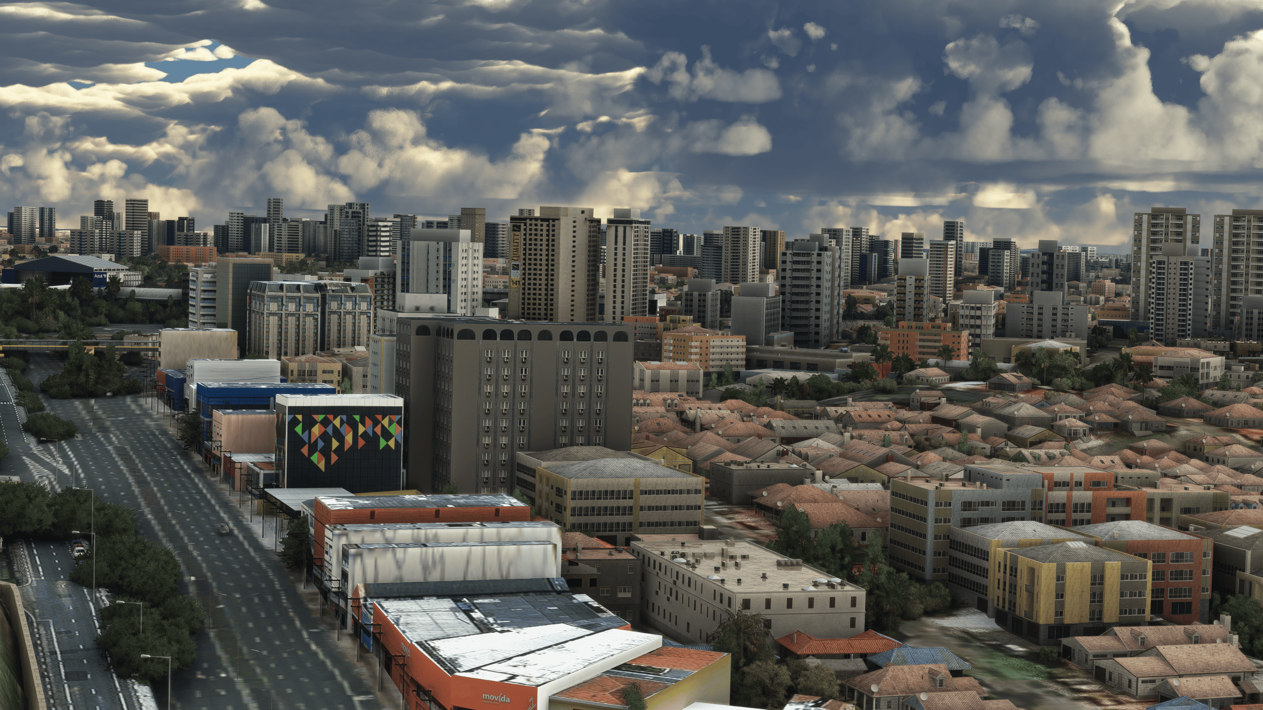 The same can not be said about the many hand-placed buildings surrounding the airport, which look a bit dated, especially under low-light conditions. They were probably reutilized from previous iterations of his work, but that does not apply to the airport itself. Then again, they are mostly there for composition, as it would feel weird to fly into a Congonhas devoid of its “human-made geography,” which makes it way scarier than it should be. So, while the logos on the buildings are a little bit blurry, at the end of the day, they still look great from afar, and you won’t be flying too close with an airliner, anyway. The hand-placed buildings also make for an authentic background instead of an ocean of Asobo-generated stuff that does not quite match the real deal.