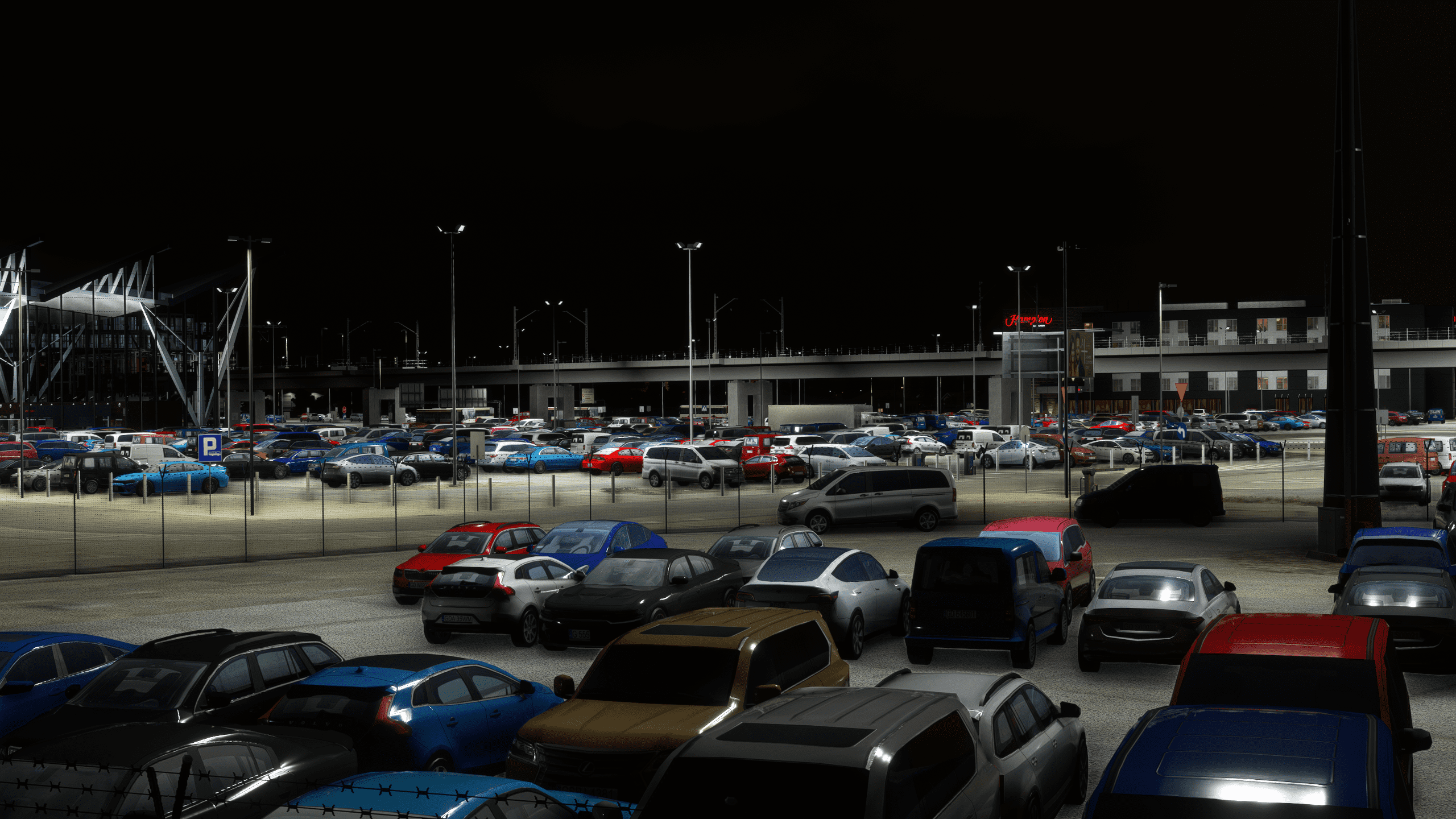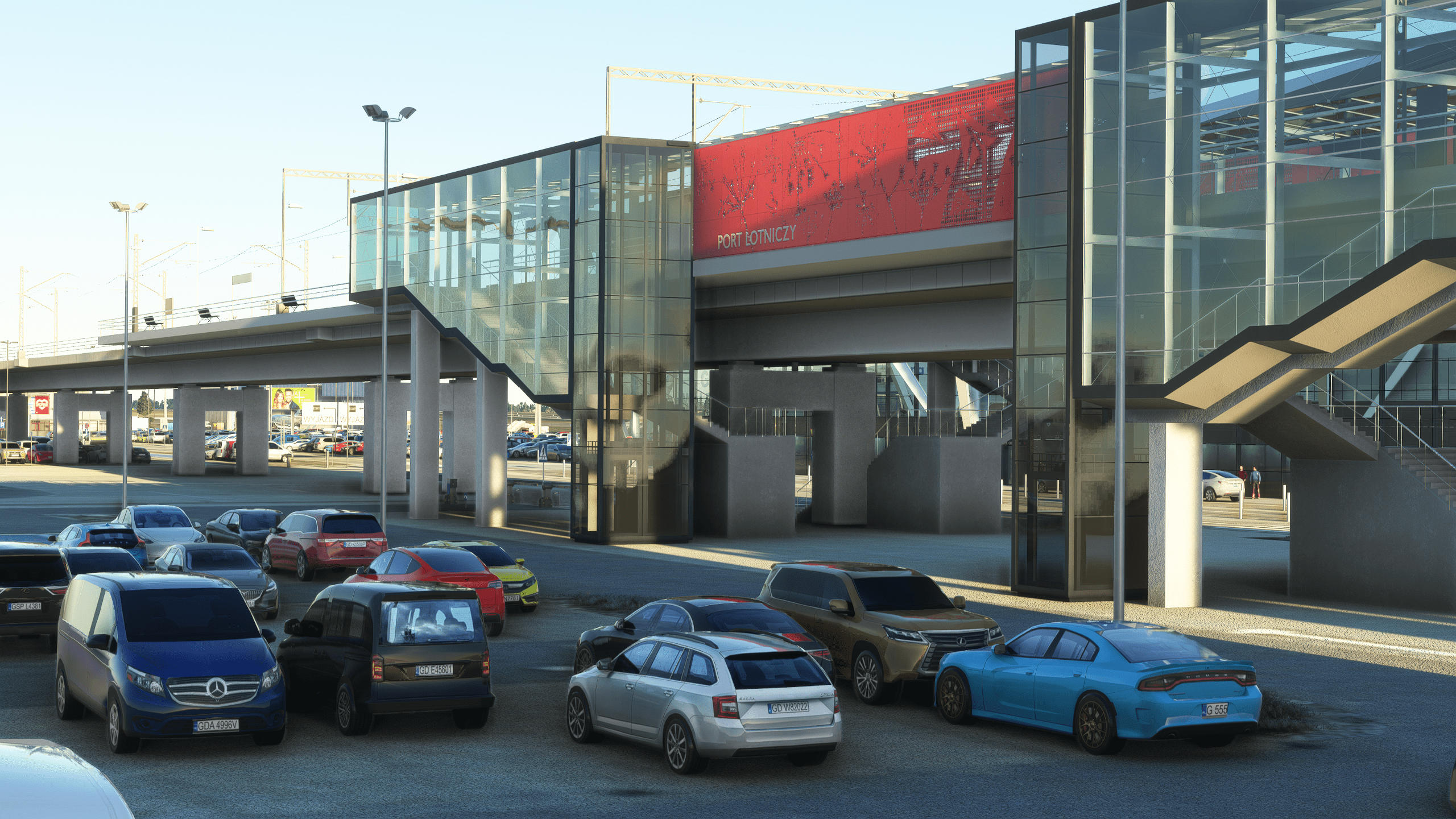 Drzewiecki Design went the extra mile with the landside detail, adding a very detailed train station near the airport with a functional train. The parking lot area shares the same amount of detail, with close attention to road signage, advertisement boards, and loads of – properly optimized – vehicles.