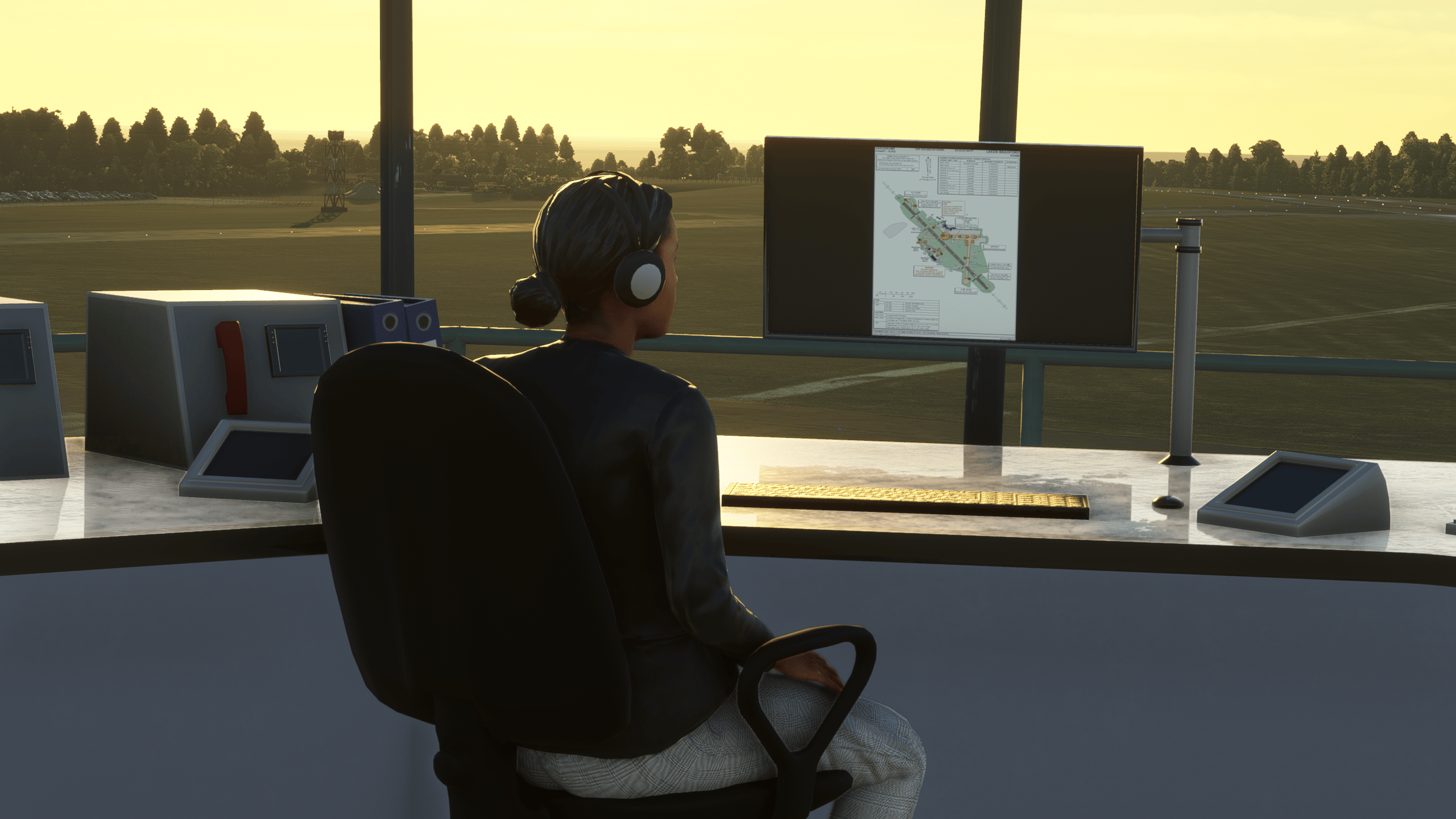 The fully modeled ATC tower is very detailed, with animated controllers, readable computer monitors, and the expected clutter of a traffic control tower.