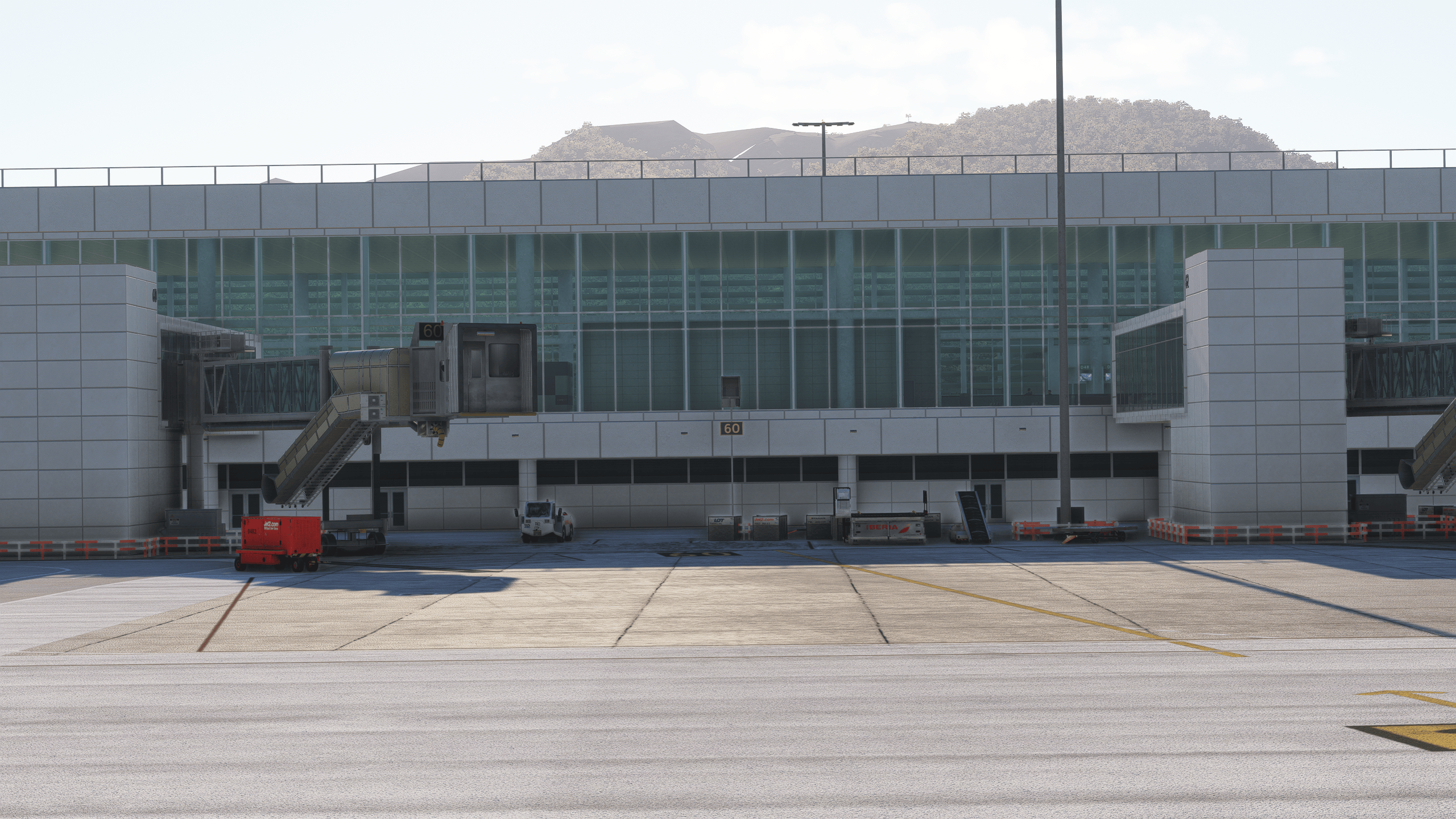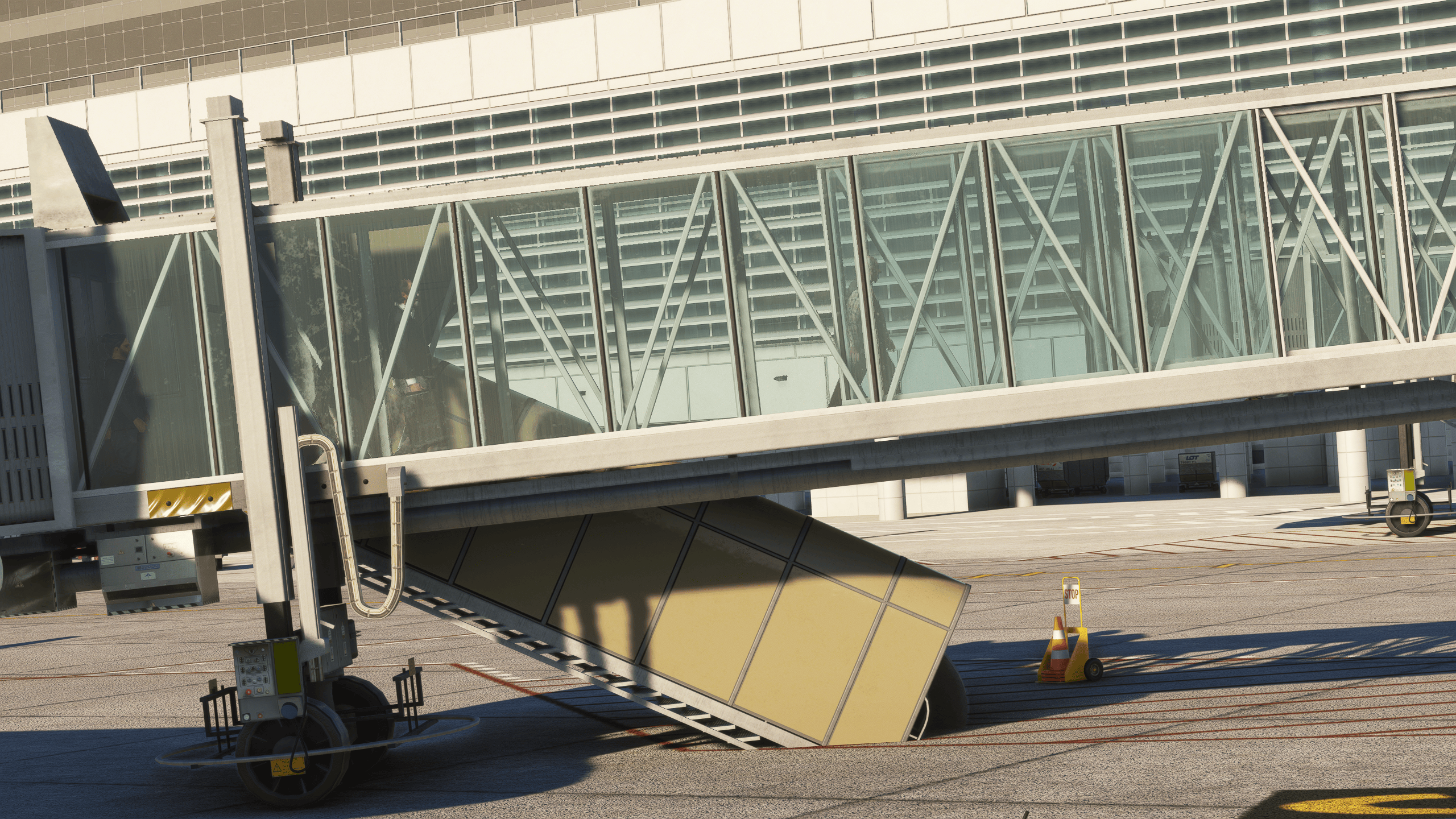 The airside experience is great, especially from the main passenger terminals. The textures are solid, the custom jetways look nice, and you can see everything that is going on inside the terminal, which only makes sense, given it’s almost entirely transparent, which kind of forces the developer to add an interior, as parallax doesn’t quite look good when the entire terminal is transparent. You can get away with terminals with slightly darker windows, but that wouldn’t work with this airport.