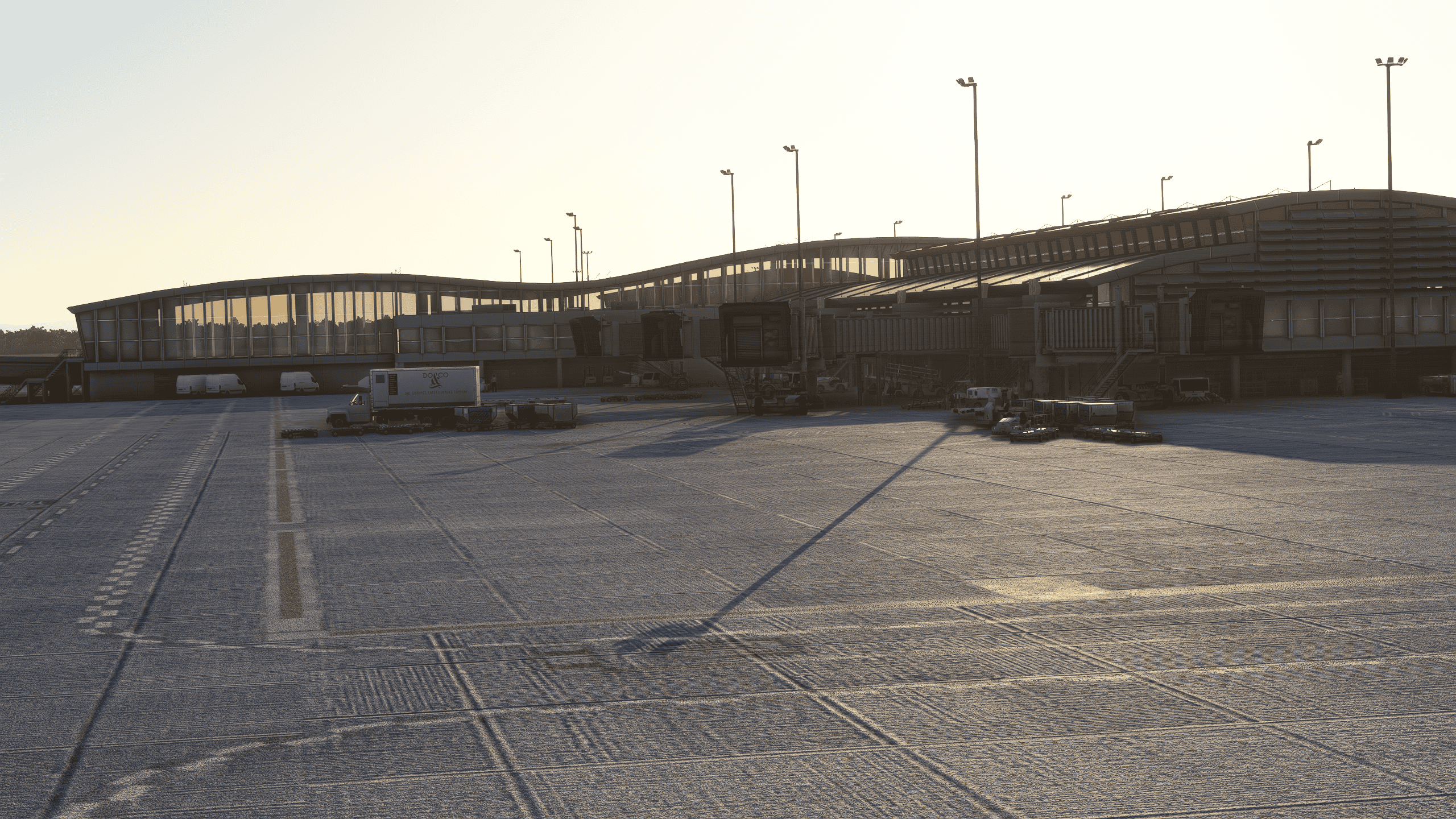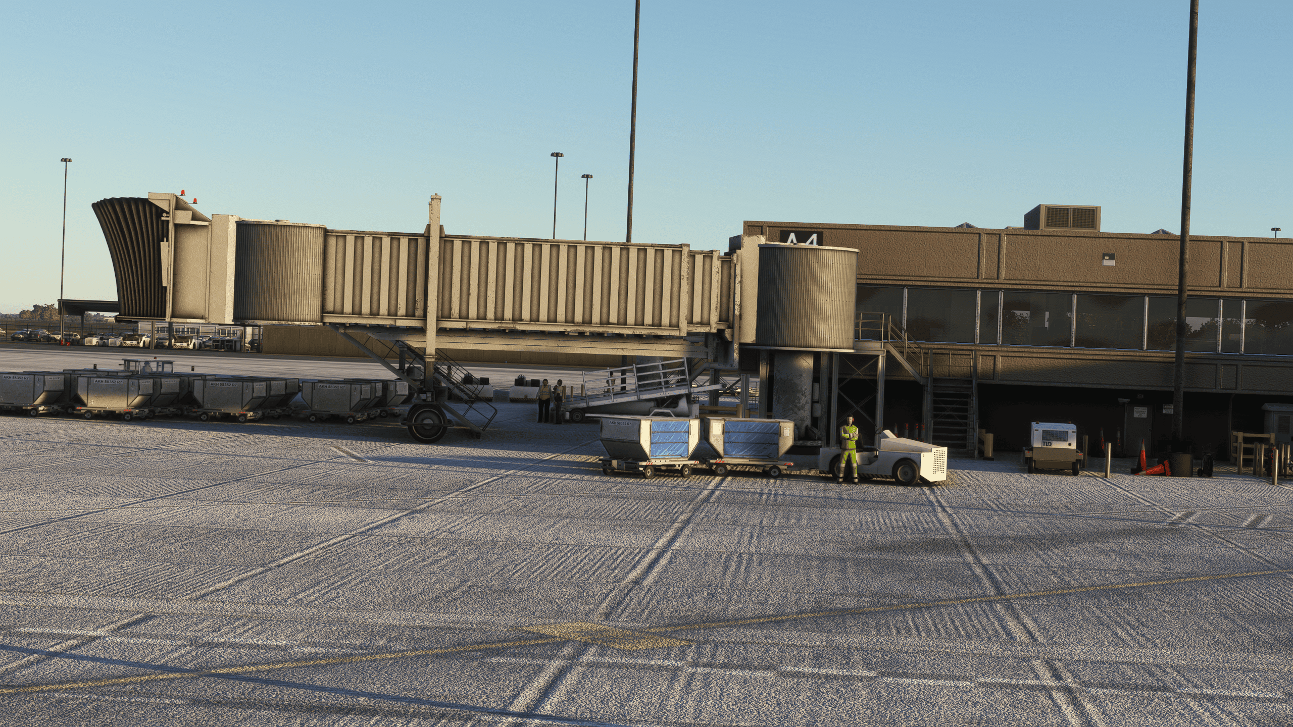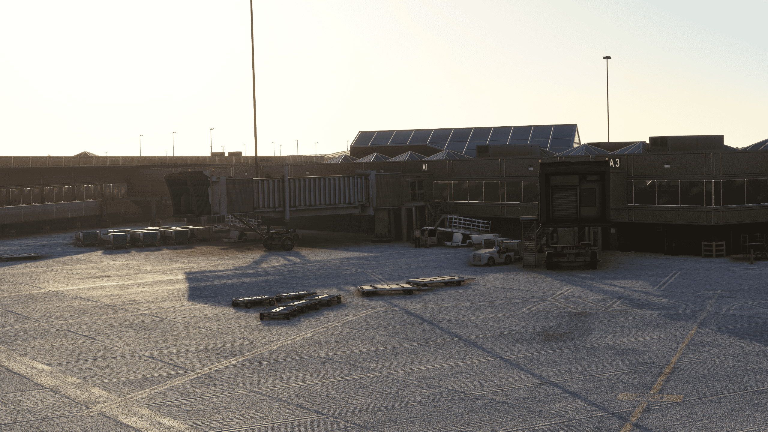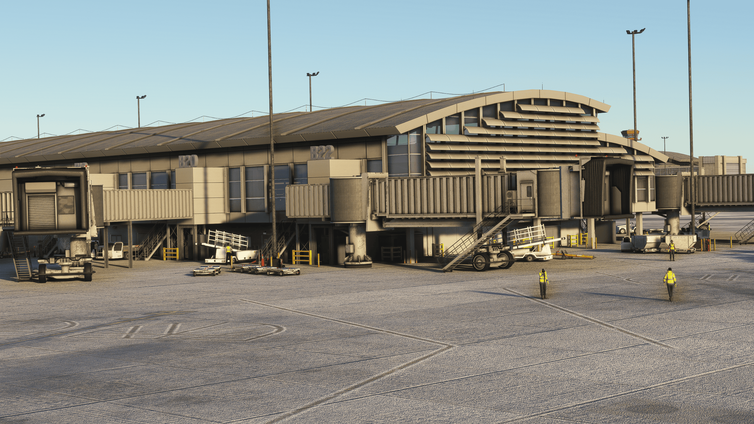 Fortunately, the modeling work is just as high-standard as the aforementioned taxiways, accurately representing both terminals and their subtleties. B, gray, modern, with fancy tridimensional gate numbers, accompanied by proper texturing with readable warning signs, “keep outs,” and bits of varying clutter spread around the gates. The PBR textures add the depth and realism that we all come to expect from Microsoft Flight Simulator products. A, from an architectural standpoint, isn’t as interesting as B, but that’s not the developer’s fault, of course. As generic as it may look, Matteo did a great job bringing it to the virtual world with great PBR textures, slightly rusty jetways, and realistic-looking glass. It’s a proper rendition all around.