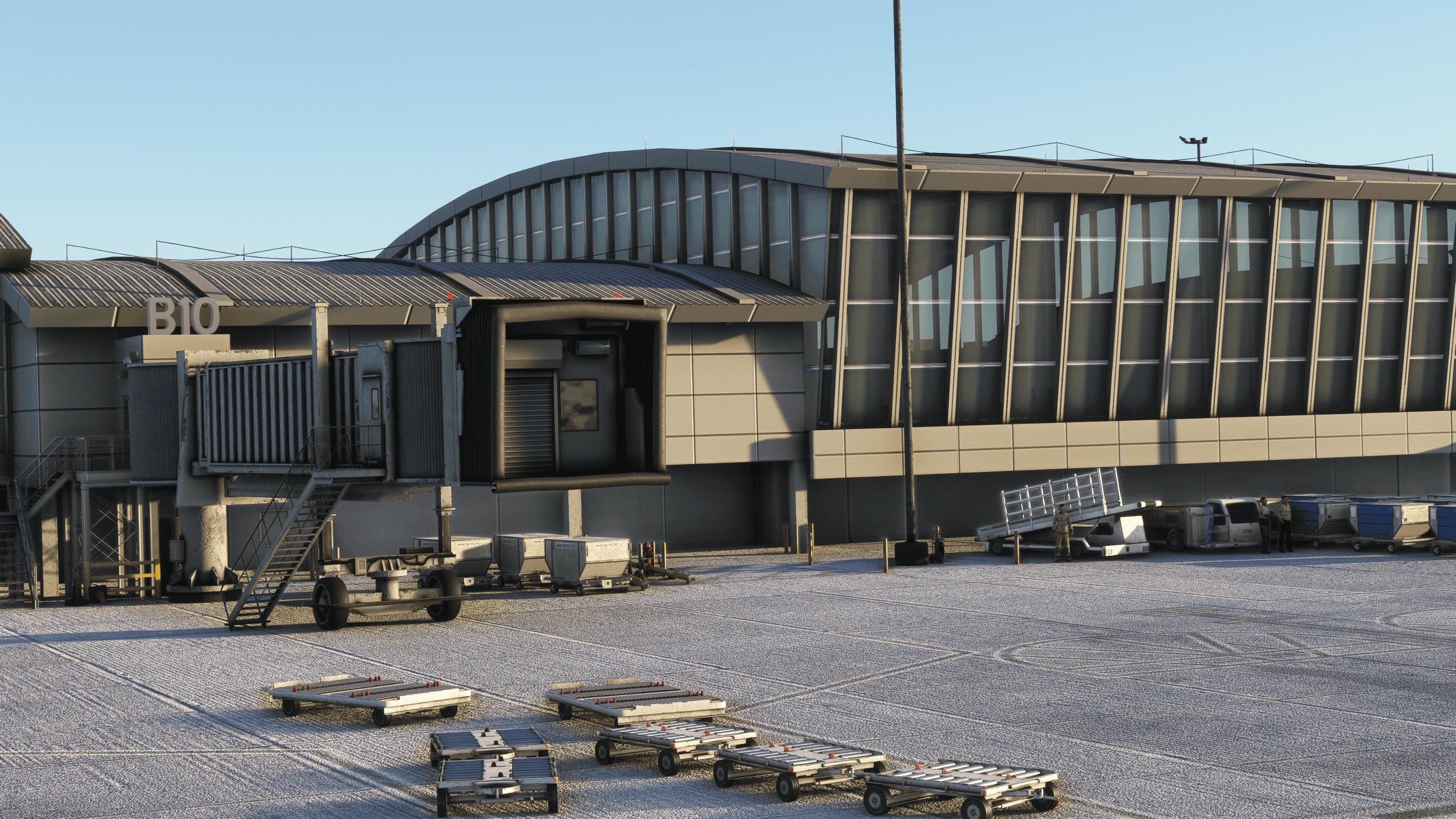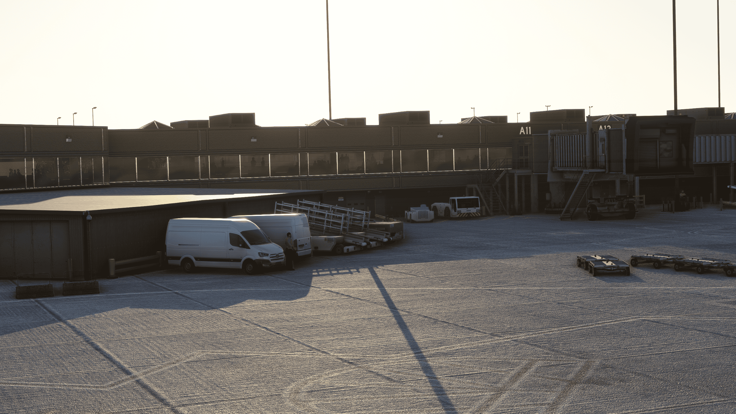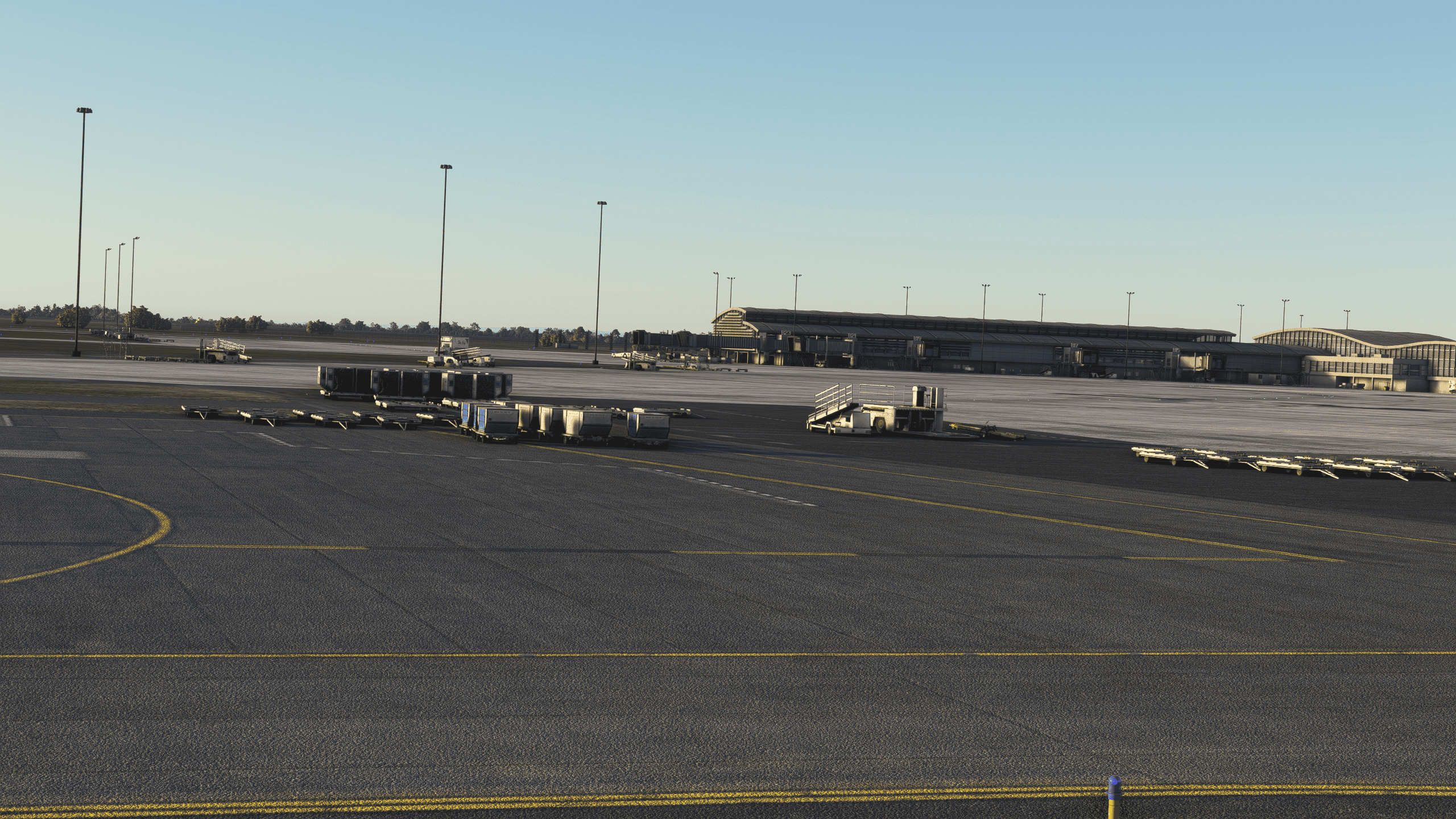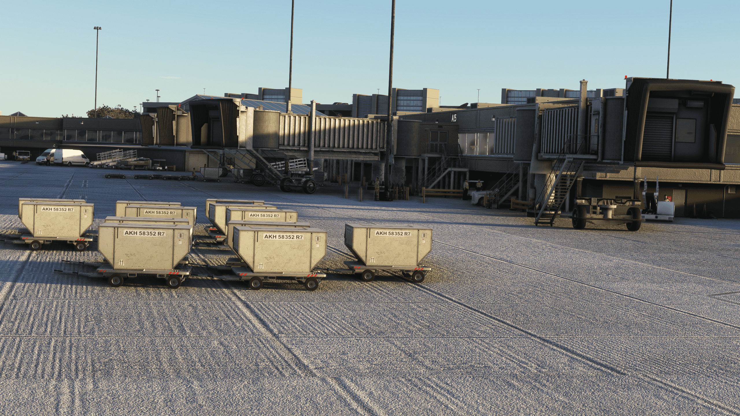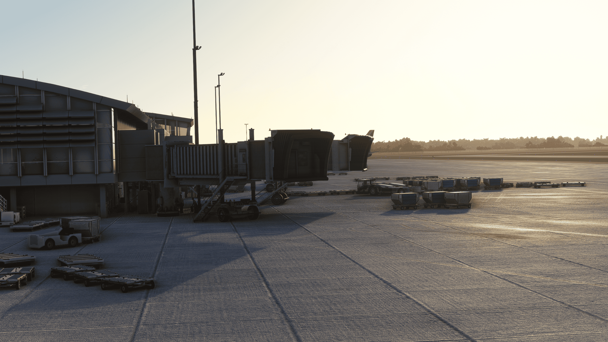 Fortunately, the modeling work is just as high-standard as the aforementioned taxiways, accurately representing both terminals and their subtleties. B, gray, modern, with fancy tridimensional gate numbers, accompanied by proper texturing with readable warning signs, “keep outs,” and bits of varying clutter spread around the gates. The PBR textures add the depth and realism that we all come to expect from Microsoft Flight Simulator products. A, from an architectural standpoint, isn’t as interesting as B, but that’s not the developer’s fault, of course. As generic as it may look, Matteo did a great job bringing it to the virtual world with great PBR textures, slightly rusty jetways, and realistic-looking glass. It’s a proper rendition all around.