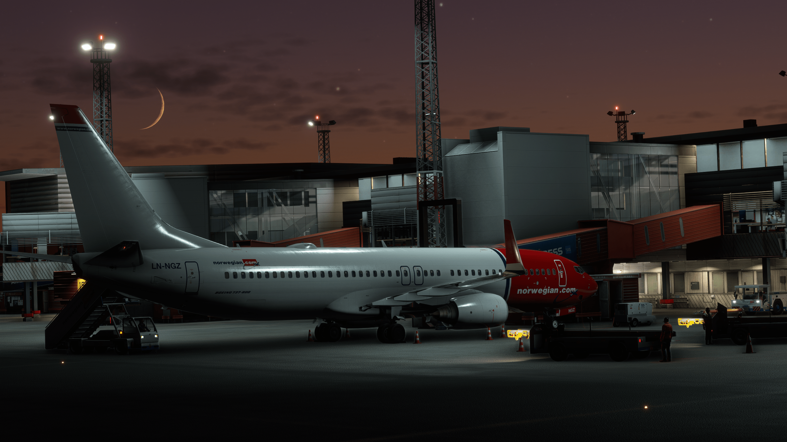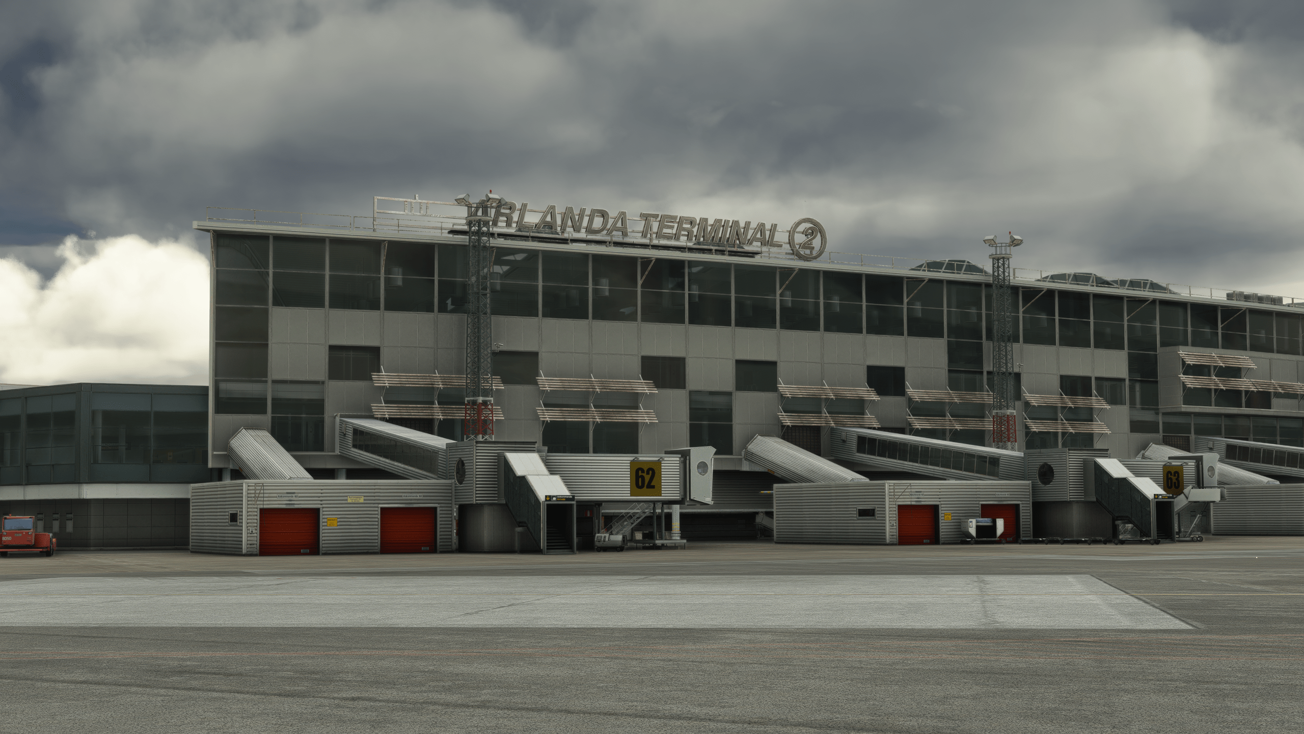 The scenery features an accurate rendition of Arlanda, with animated jetways, VDGS, terminal interiors, custom ground service equipment, weather-influenced snowbanks, a high-resolution mesh, and a custom GSX profile.
