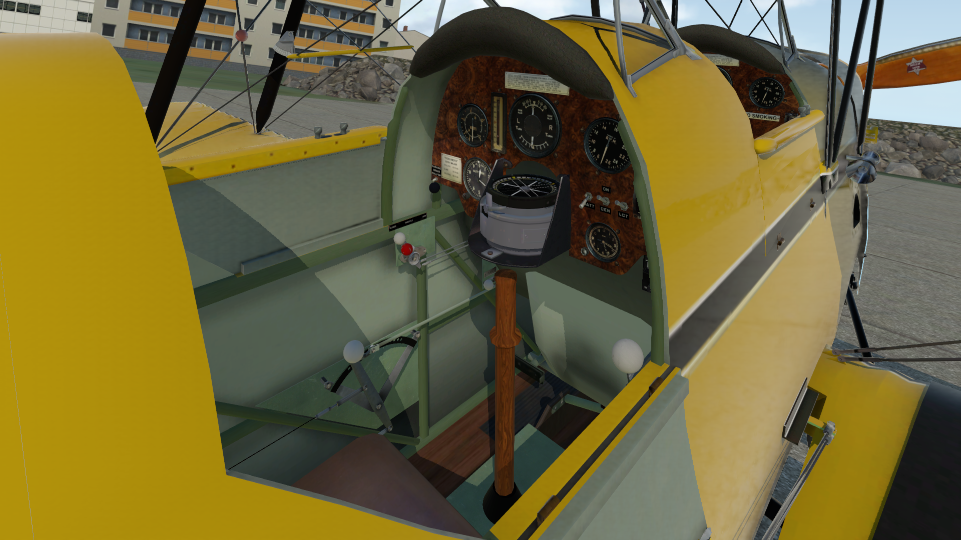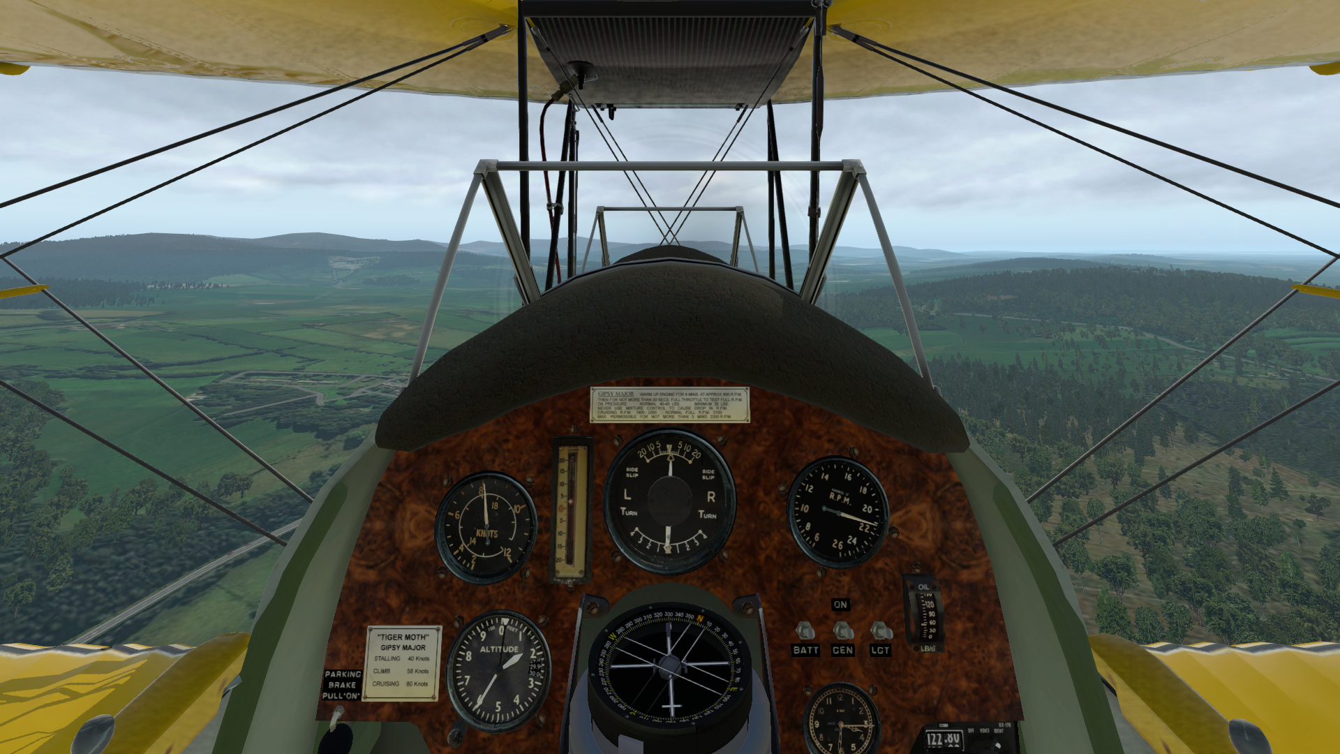 The Cockpit of the Moth consists of a simple layout with throttle and fuel mixture control to the left of the pilot, fuel cut-off below the main panel to the left, parking brake to the left of the panel, tail wheel lock to the right, pedals and stick. Along with these controls is an even simpler arrangement of switches for battery, generator and a non-functional light switch on the main panel, along with the magneto switch on the side of the fuselage itself, just outside of the cockpit. It should be noted that for a pilot that isn’t familiar with the Moth, like many planes before it, there is no starter. To start the engine, the pilot needs to manually crank the prop itself.