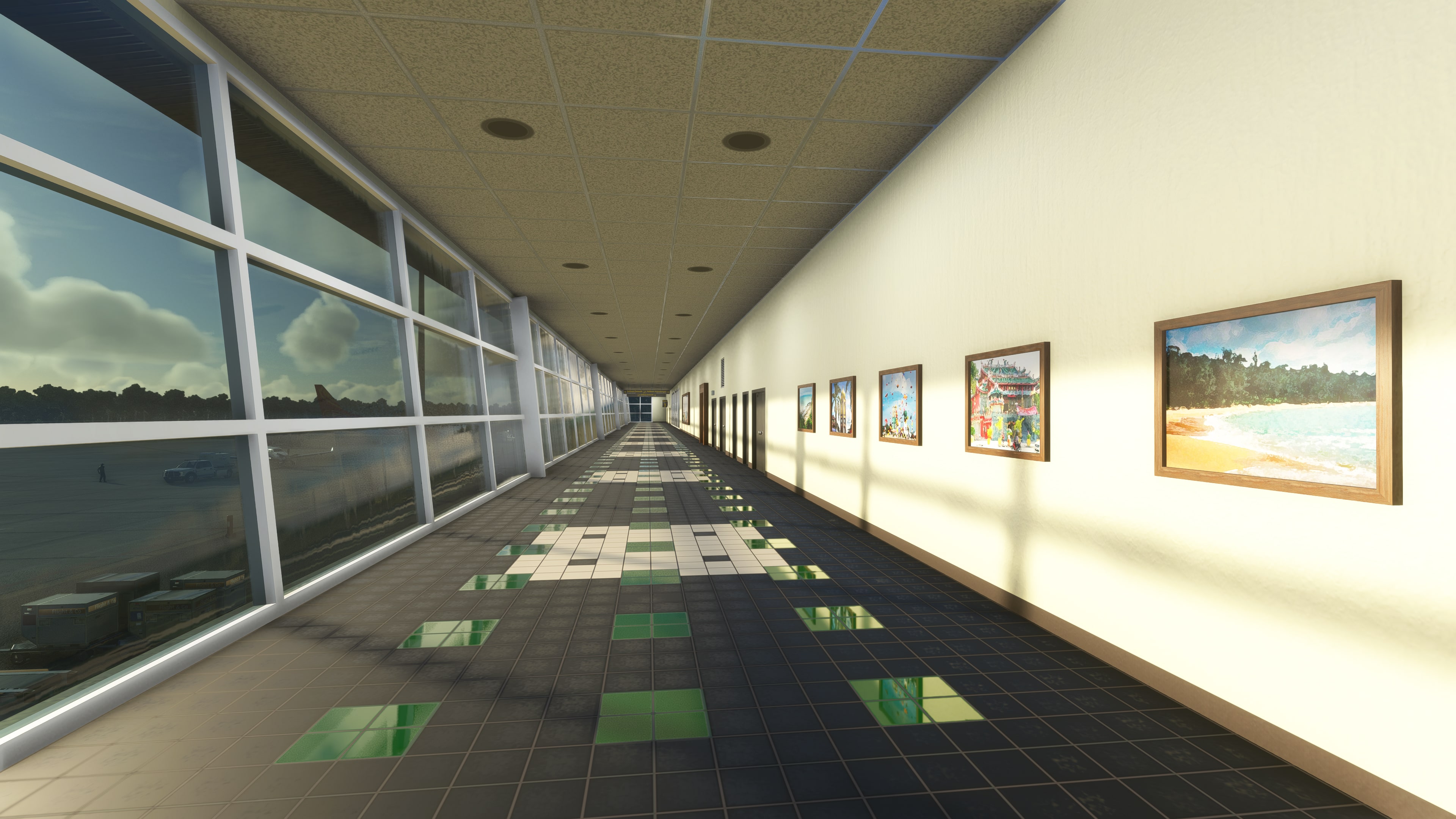 The scenery features an accurate rendition of the airport, with PBR texturing, an in-house VDGS system, custom animated jetways, custom ground textures, a true-to-life passenger terminal, custom terraforming, and more.